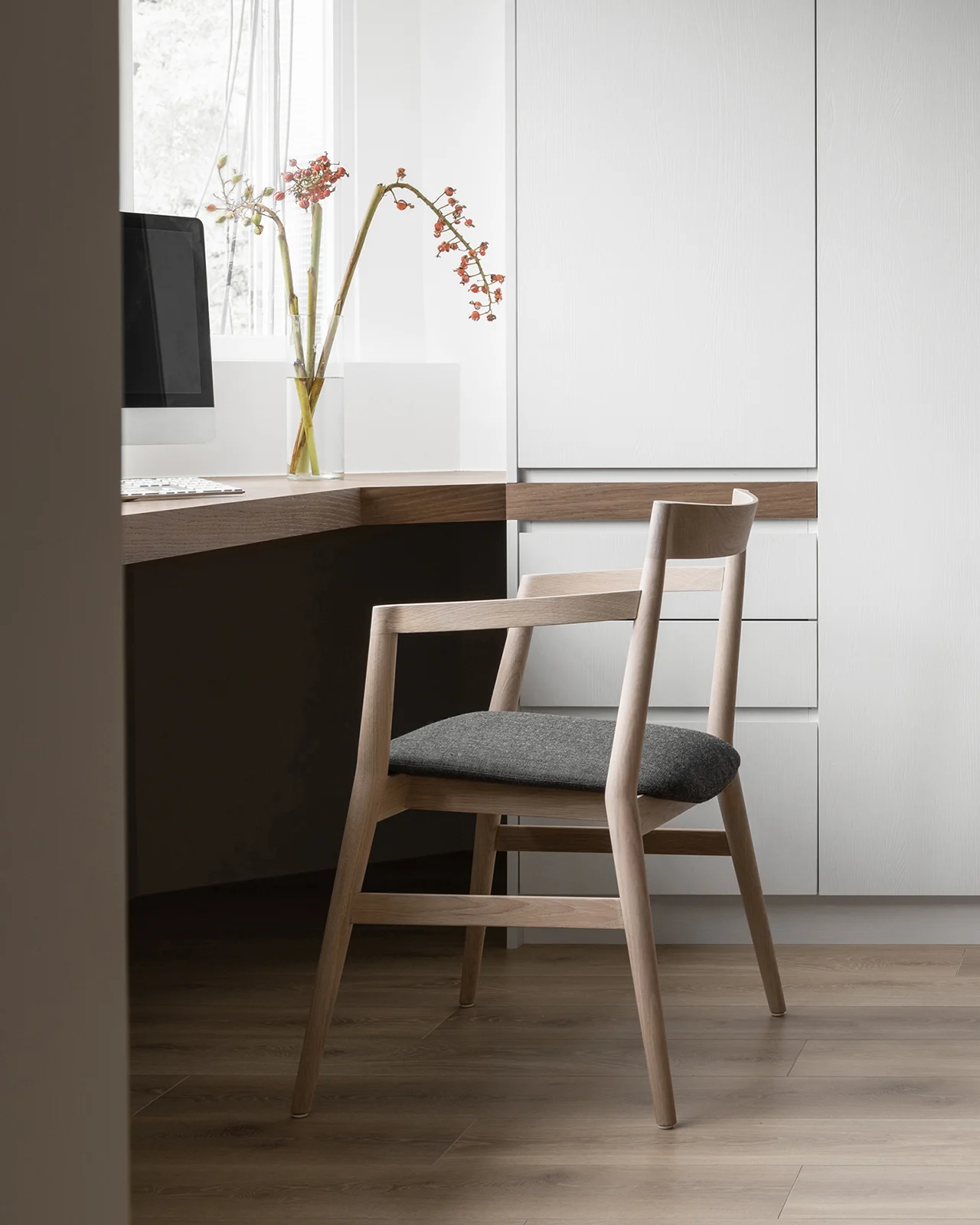 Dobra reimagines the archetypal wooden chair with armrests into something graceful and subtly dynamic. Its defining feature, the gentle ‘break’ in the geometry of the front legs, brings movement and freshness to a familiar form. Rounded turned elements flow seamlessly into soft, lenticular cushions, creating a balance of strength and delicacy.
