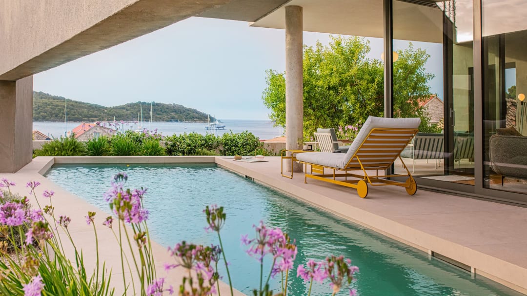 Das Haus liegt eingebettet in die Hügel oberhalb der Stadt Vis, vor der unberührten Kulisse der dalmatinischen Küste, und bietet sowohl Abgeschiedenheit als auch einen weiten Meerblick. Seine Architektur schafft ein ausgewogenes Gleichgewicht zwischen Privatsphäre und Offenheit und verbindet das lokale Klima und den Lebensstil mit durchdachtem Design und fließenden Raumverhältnissen.