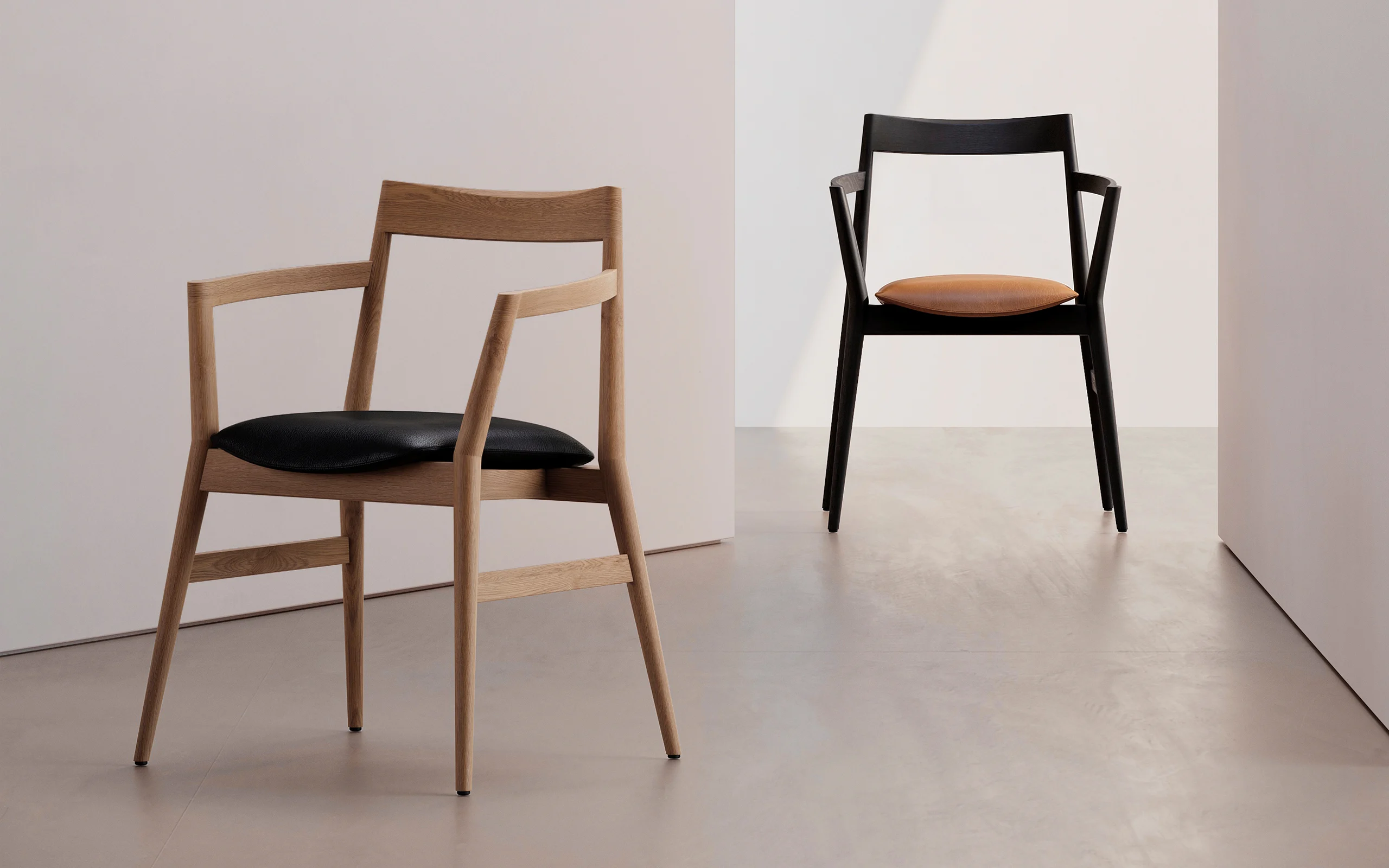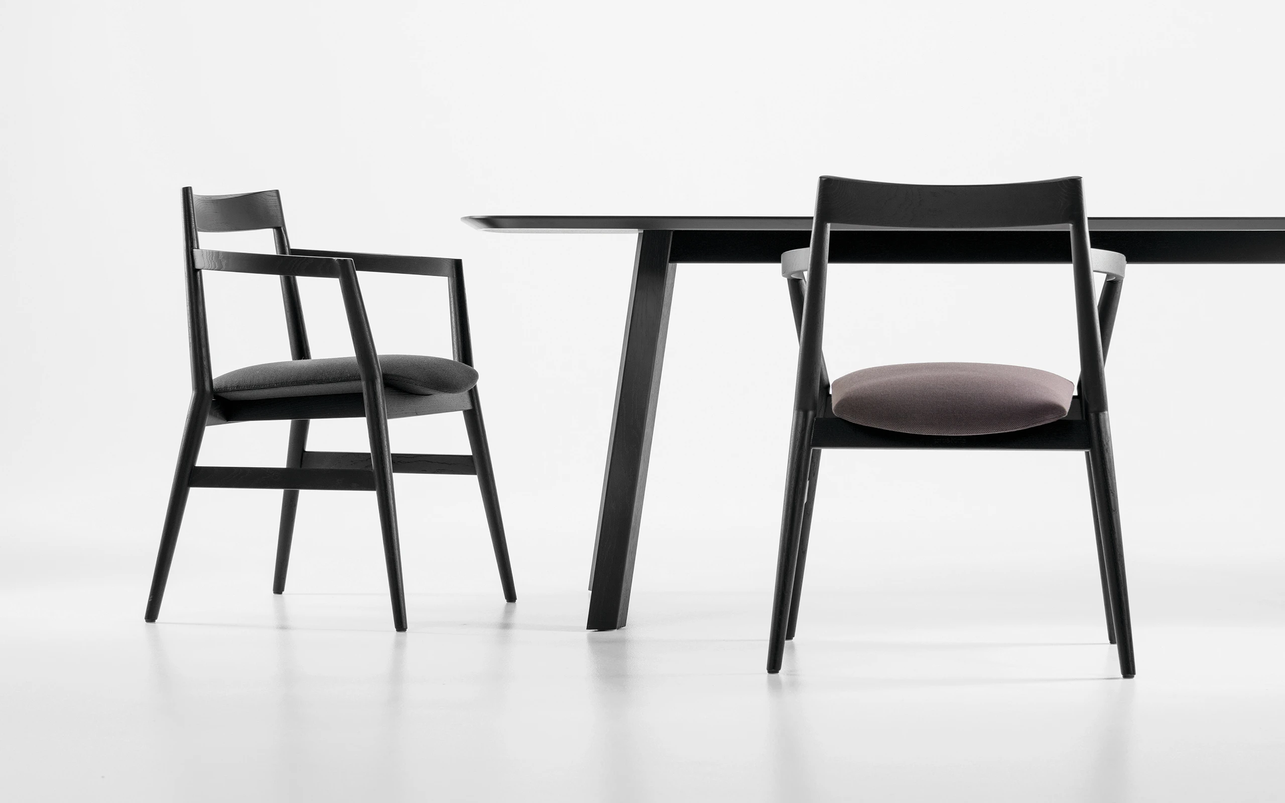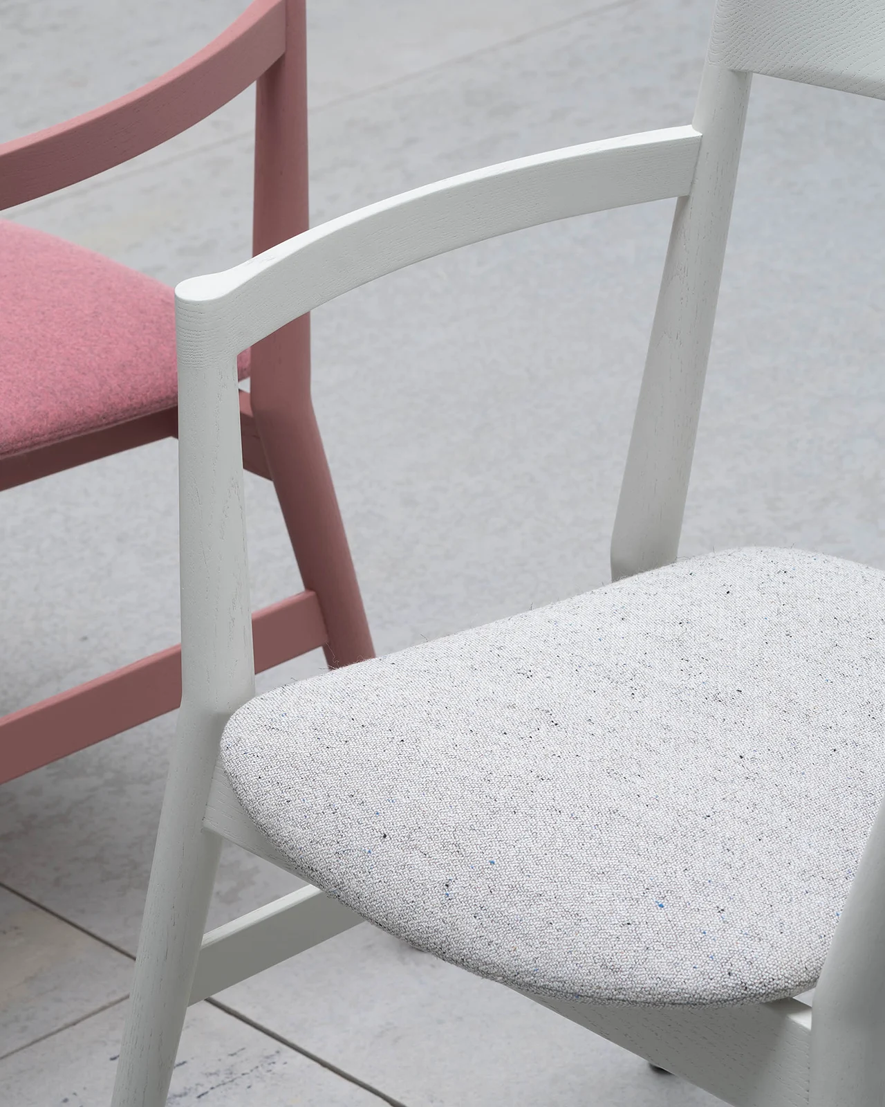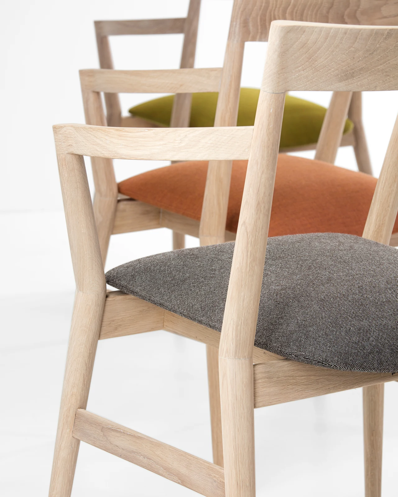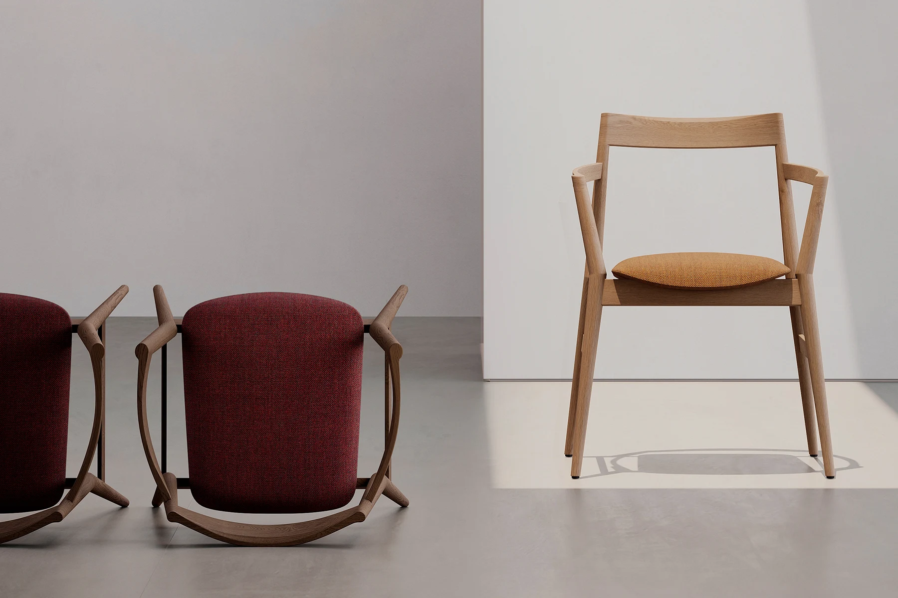 Dobra interpretiert den archetypischen Holzsessel neu und verwandelt ihn in etwas Anmutiges und subtil Dynamisches. Sein charakteristisches Merkmal, ein sanfter Bruch in der Geometrie der Vorderbeine, bringt Bewegung und Frische in vertraute Form. Die abgerundeten, gedrechselten Elemente gehen nahtlos in weiche, linsenförmige Kissen über und schaffen so eine Balance aus Kraft und Zartheit.