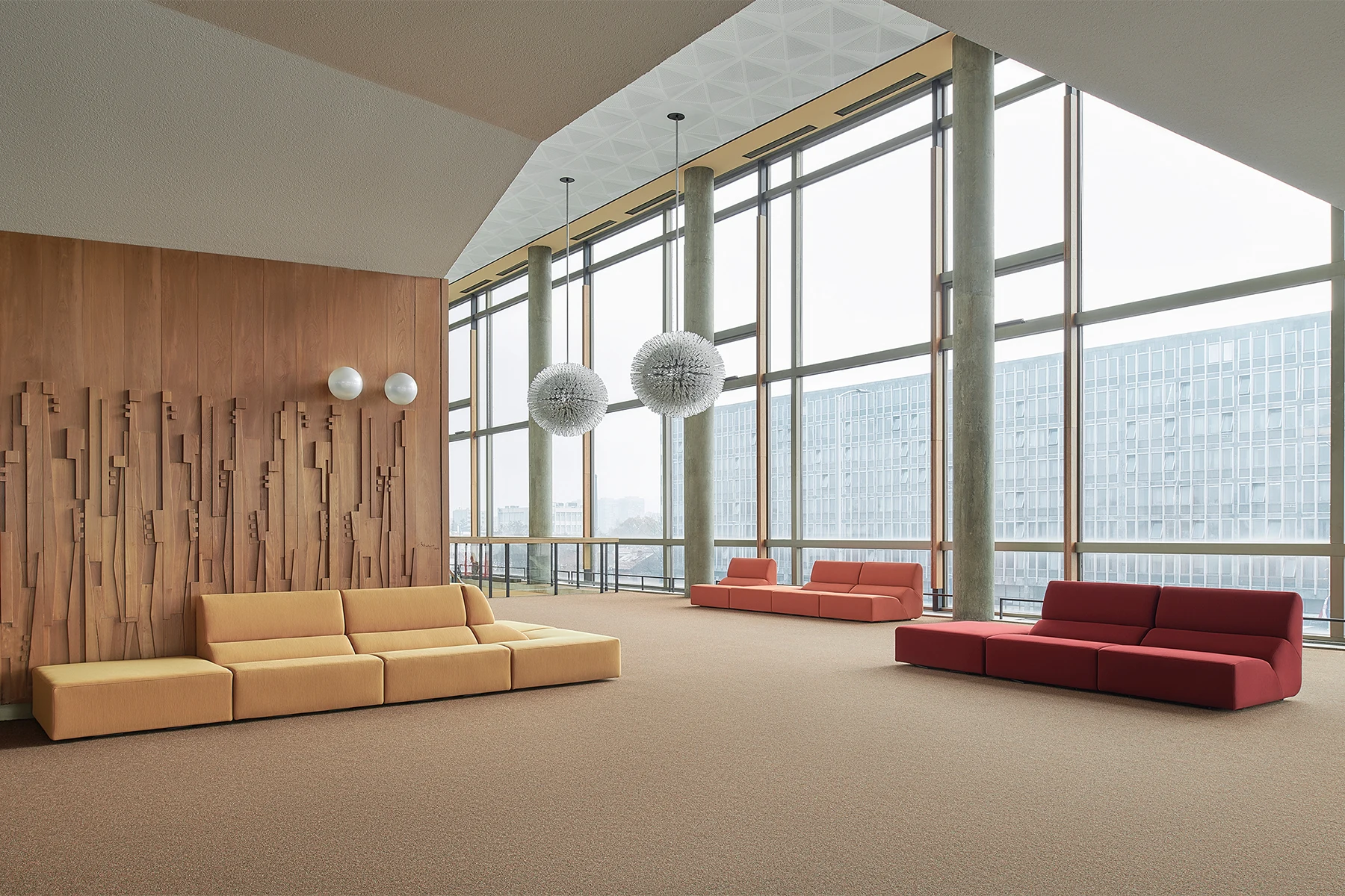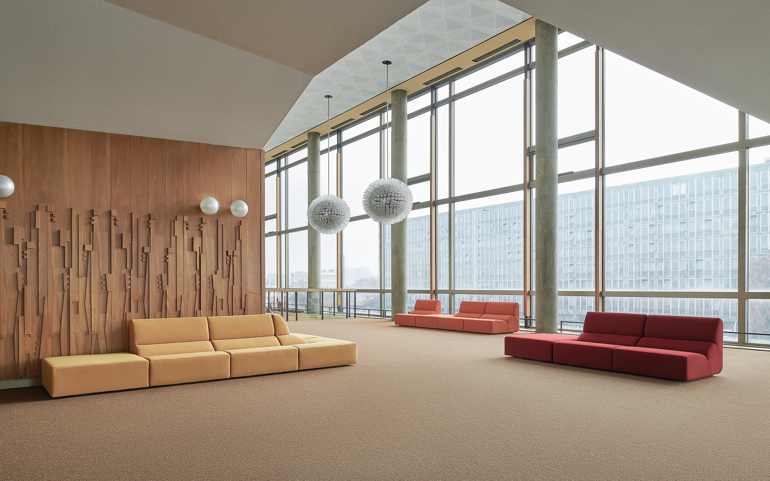 Layout ist als modulare Kombination aus Architektur und Design konzipiert. Es ist ein System, das Innenräume in fließende, anpassungsfähige Landschaften verwandelt. Bestehend aus vier Grundkomponenten bietet es unzählige Möglichkeiten zur Raumgestaltung – von gemütlichen, fast intimen Ecken bis hin zu großzügigen Sitzlandschaften. Seine klare, radikal schlichte Geometrie bildet eine pragmatische Grundlage für die Gestaltung großer öffentlicher Räume, eignet sich aber ebenso für private Umgebungen, die zum Verweilen, Gespräche und Geselligkeit einladen.