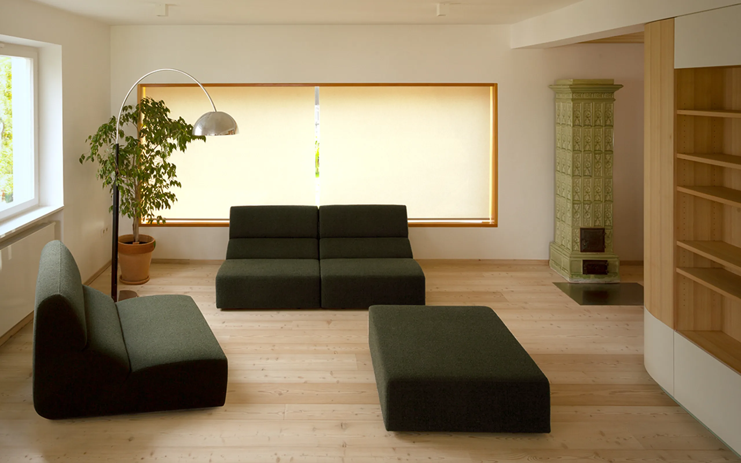 Die miteinander verbundenen Elemente bilden eine sanfte Innenraumlandschaft.