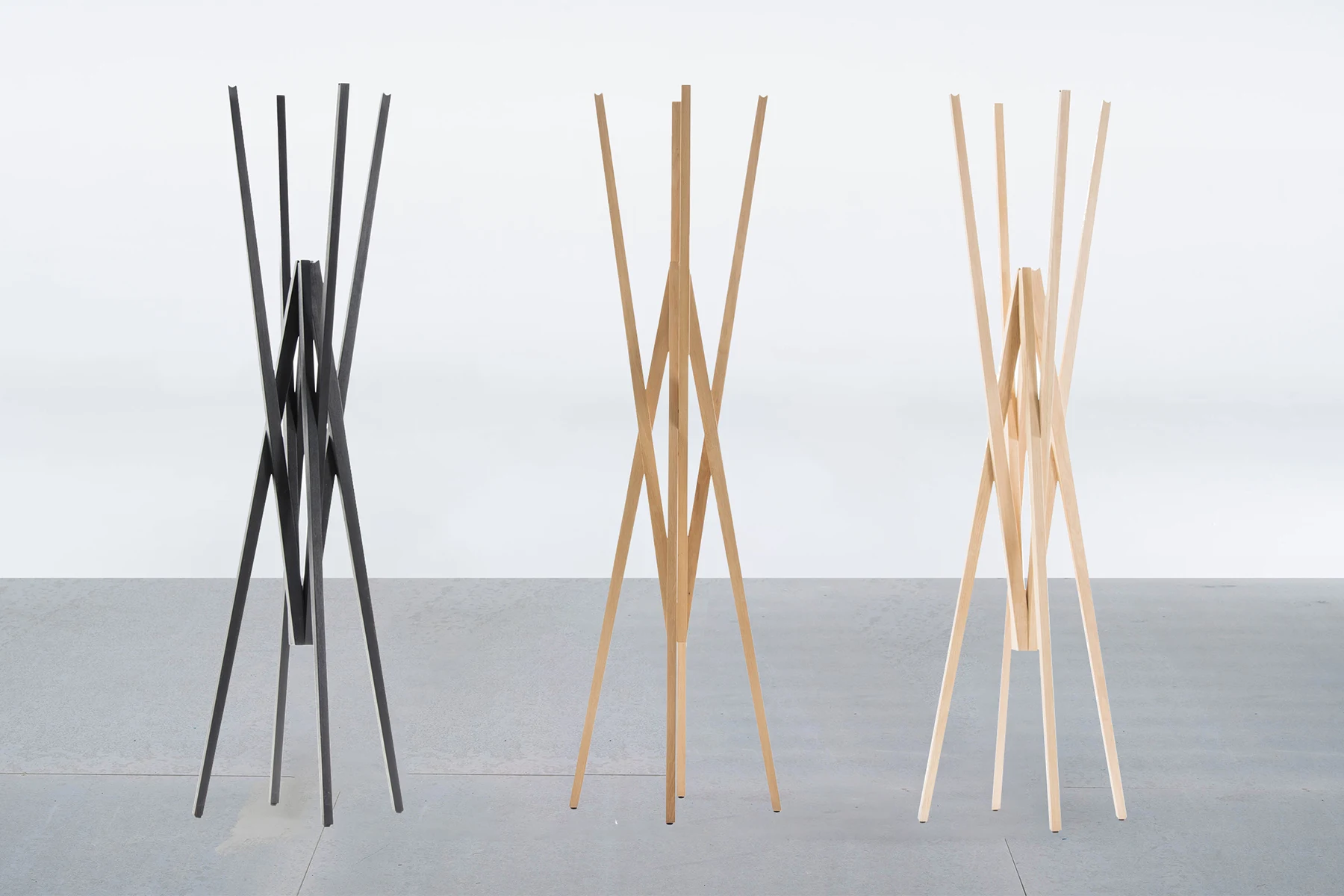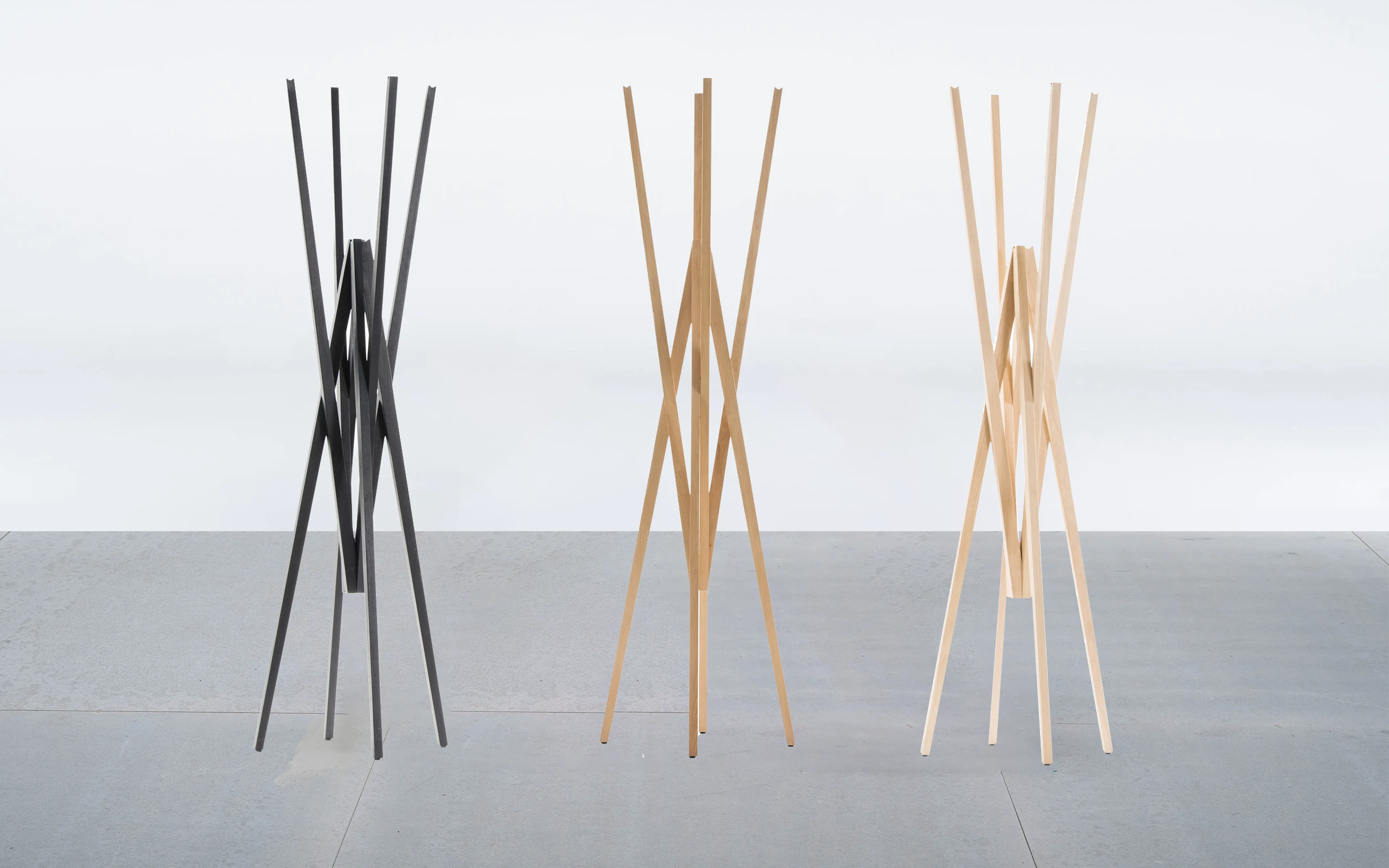Subtile Veränderungen in der Symmetrie verleihen dem Kleiderständer seinen lebendigen, skulpturalen Charakter.