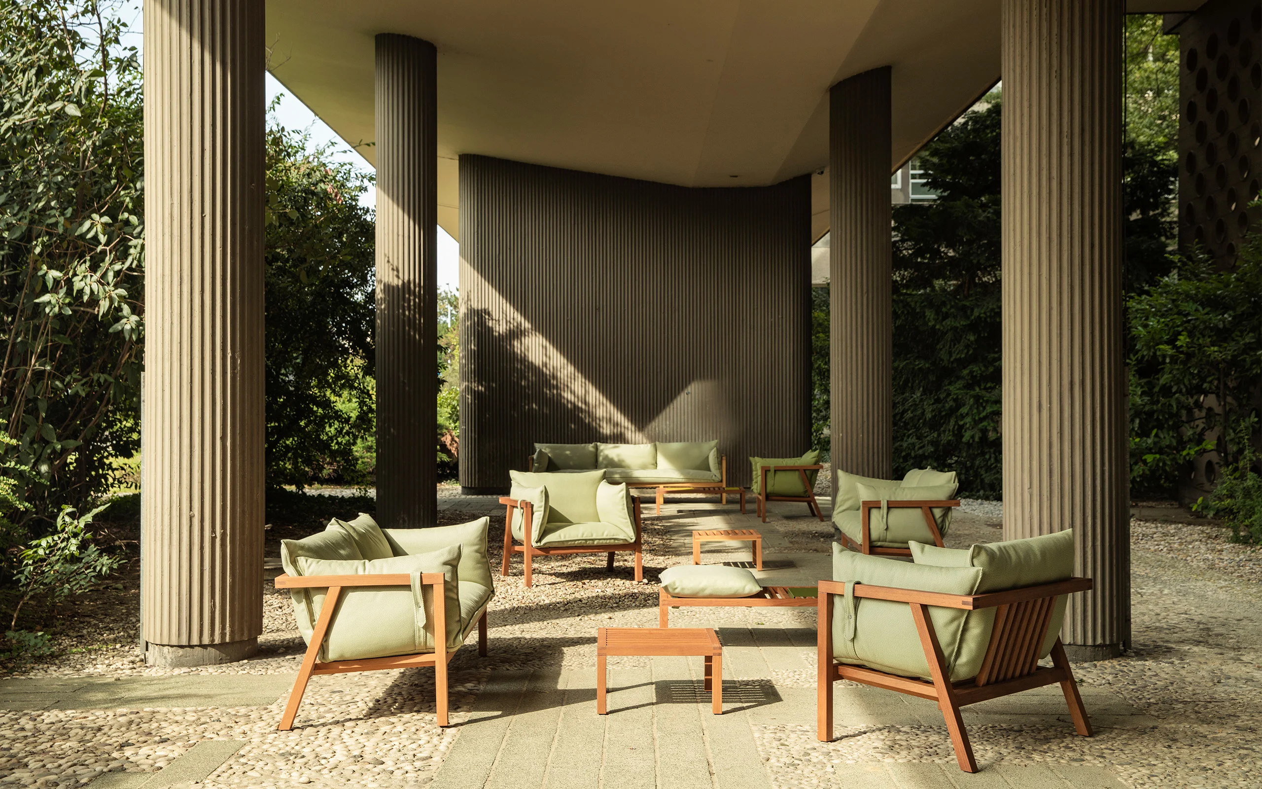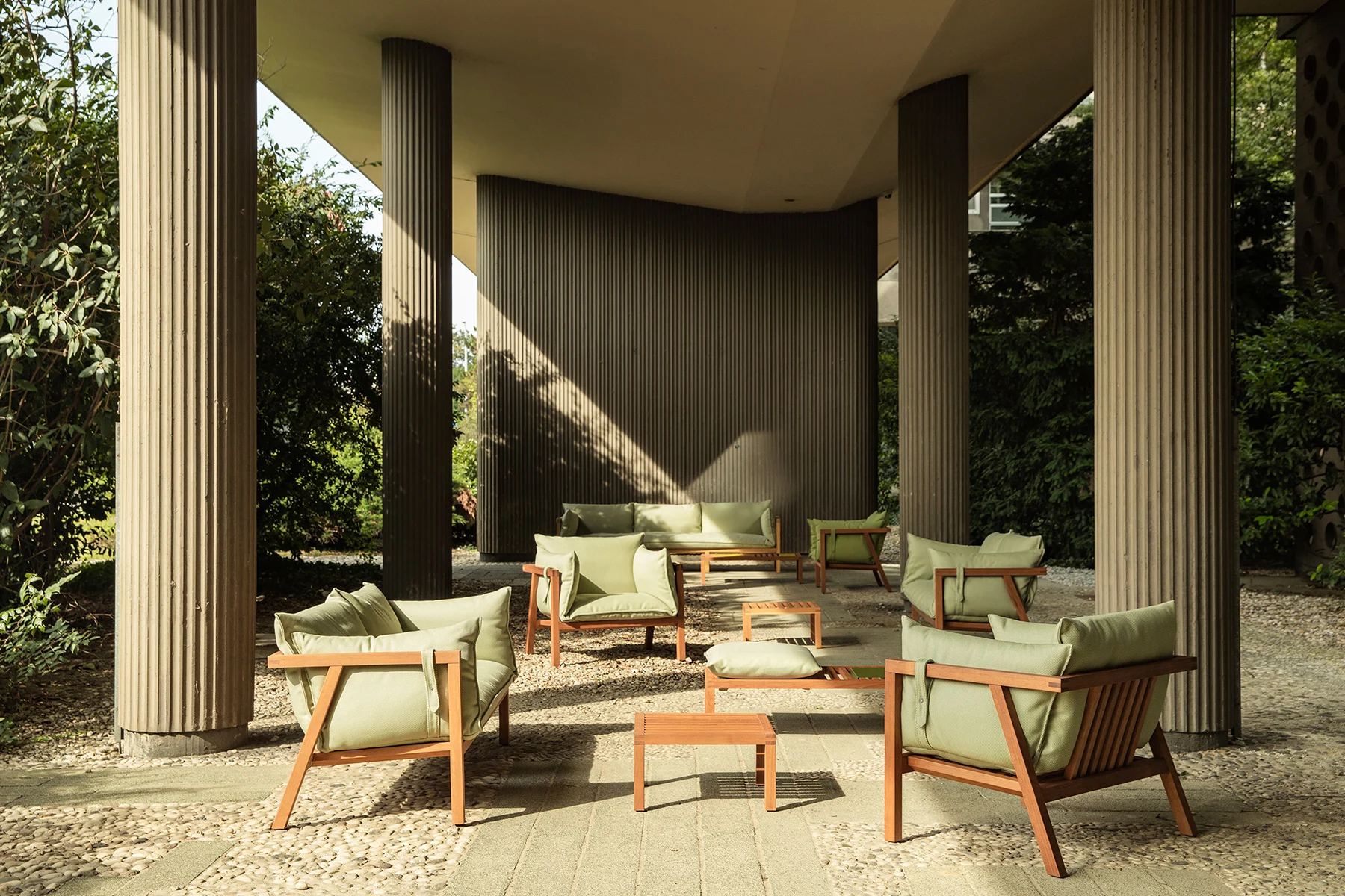Die Kollektion Umomoku ist eine haptische Einladung zur Entschleunigung. Diese Outdoor Kollektion wurde für Momente des ruhigen Genusses geschaffen und kombiniert die Schlichtheit von Holzlatten mit weichen Kissen, die die Behaglichkeit eines Aufenthalts im Innenbereich, jedoch unter freiem Himmel vermitteln. Mit ihrer entspannten Haltung und den großzügigen Proportionen verwandelt Umomoku Terrassen, Innenhöfe und Poolbereiche in intime Oasen der Entspannung.