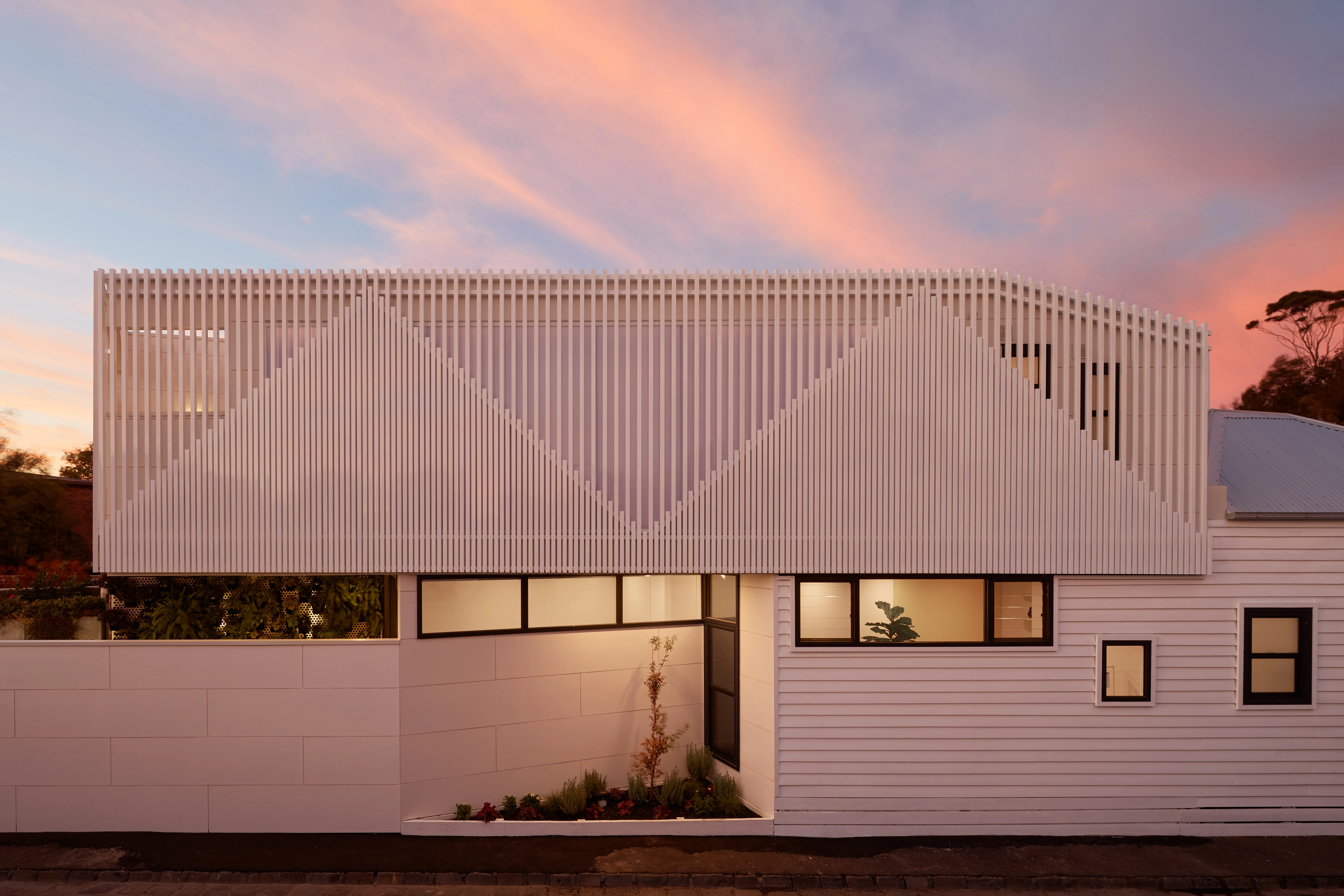 Das von WALA entworfene Haus verfügt über Wohnzimmer im Obergeschoss, Schlafzimmer im Untergeschoss und eine Lattenfassade, die auf die Giebeldächer der viktorianischen Typologie verweist.