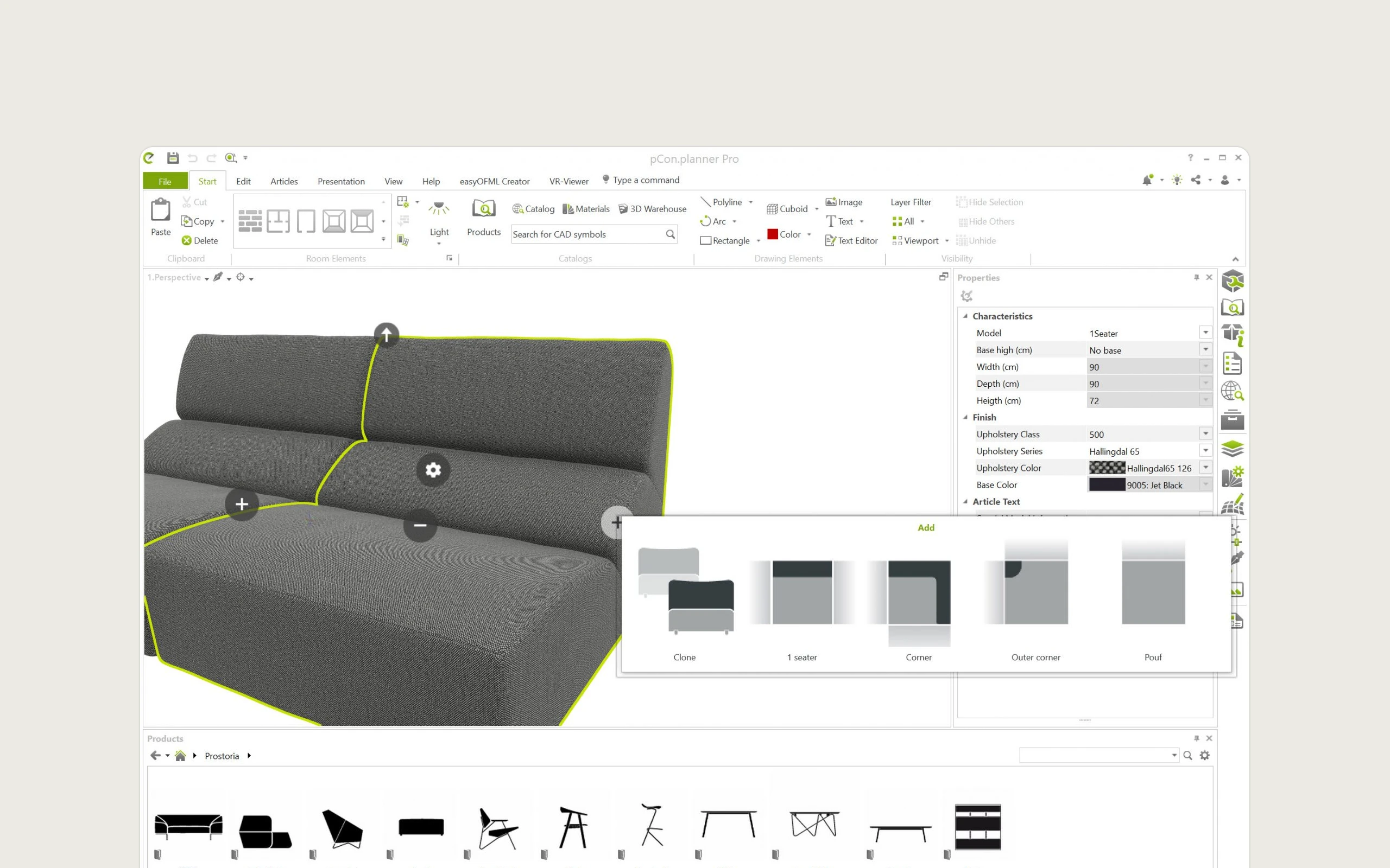 With pCon.planner, the desktop application, you can plan spaces in 3D, configure Prostoria products in detail, select finishes and create complex compositions. The software allows exporting CAD models, generating article lists and project documentation, making it a powerful tool for architects and designers working on comprehensive layouts.