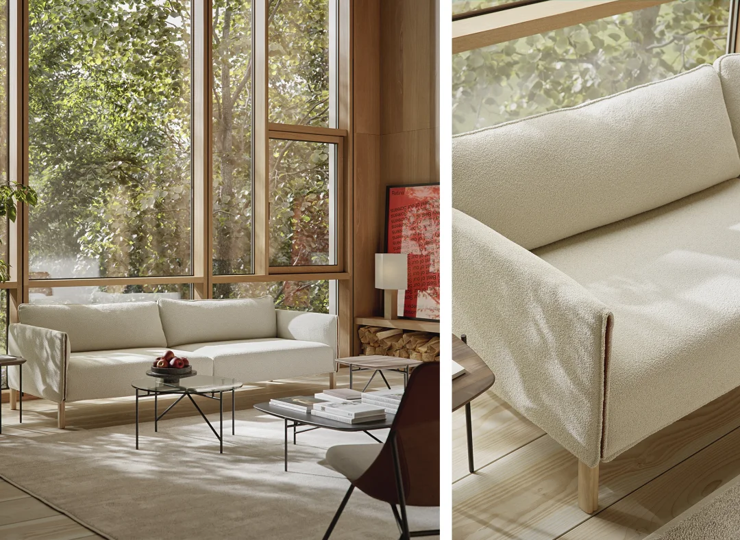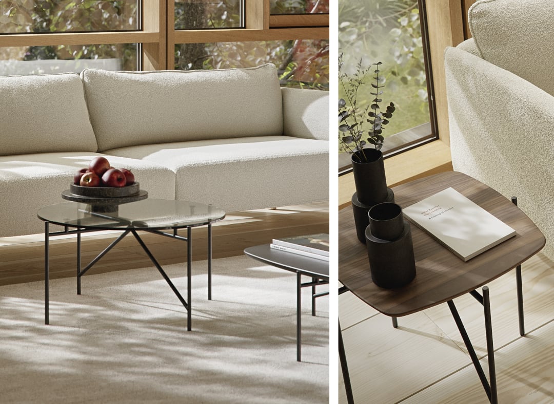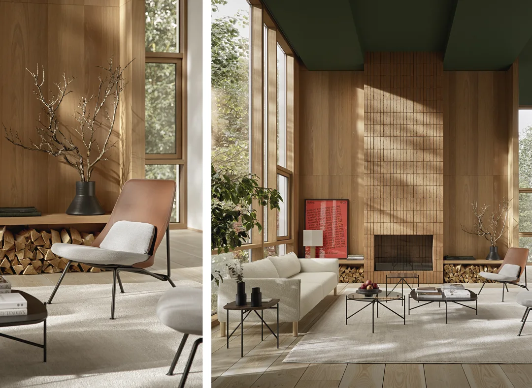 Découvrez comment créer une ambiance chaleureuse avec le canapé Spectrum associé aux fauteuils bas Strain et à un ensemble de tables Tinker.