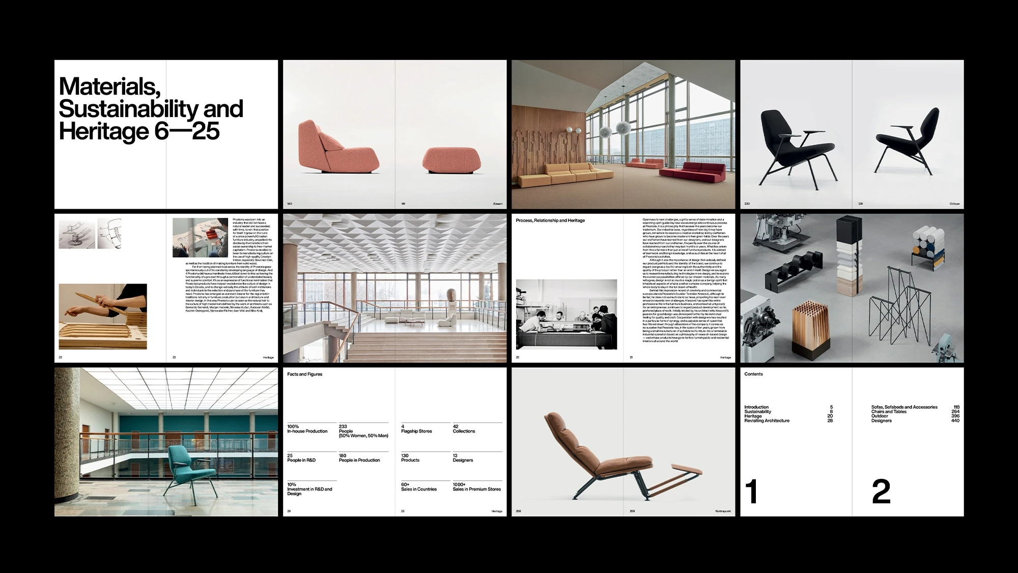 Il est divisé en deux parties, donnant un aperçu de notre patrimoine, de notre processus de conception et de fabrication et des projets spéciaux tels que Sustainability et Revisiting Architecture, ainsi que du catalogue de produits. L'identité de Prostoria 10 et de tous les supports associés, qu'il s'agisse d'imprimés, de films ou d'animations, de souvenirs ou de panneaux d'exposition, a été créée par Kurppa Hosk dans le cadre du système d'identité plus large de notre anniversaire.