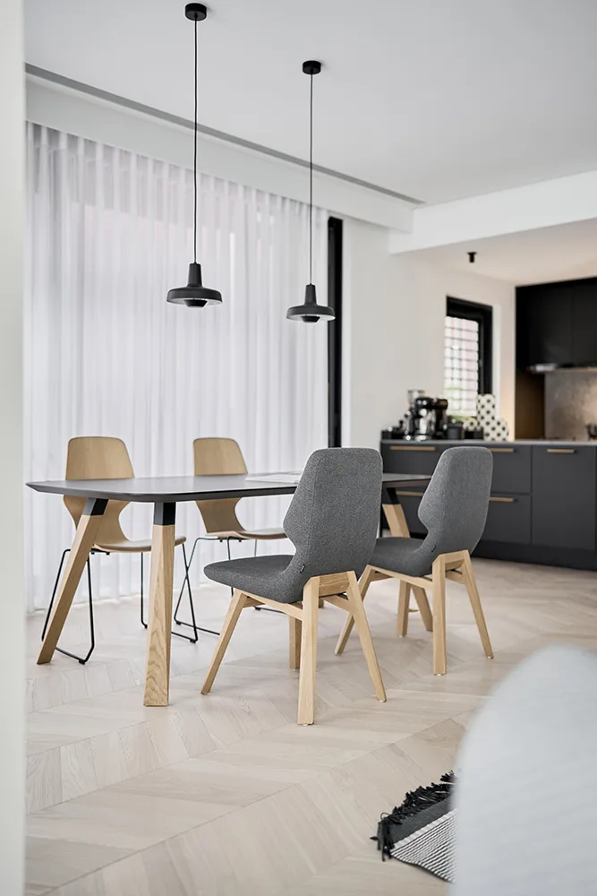 La salle à manger est meublée de chaises Oblique et Oblikant avec table à manger Oblique et dans le salon Absent Sofa et le fauteuil Strain permettent de se prélasser confortablement, tandis que le système de rangement Shtef en noir ajoute élégance et fonctionnalité moderne à l'intérieur.