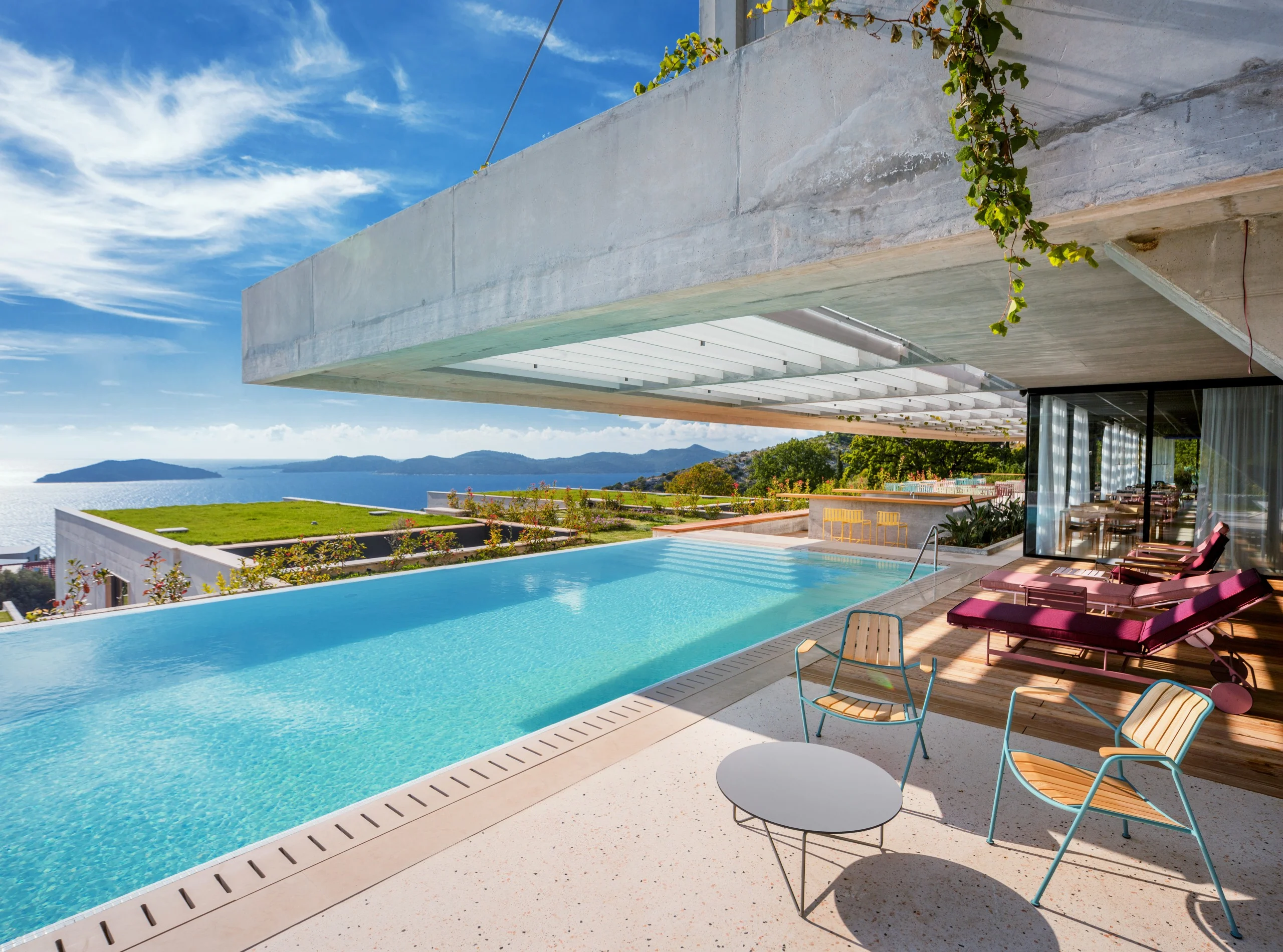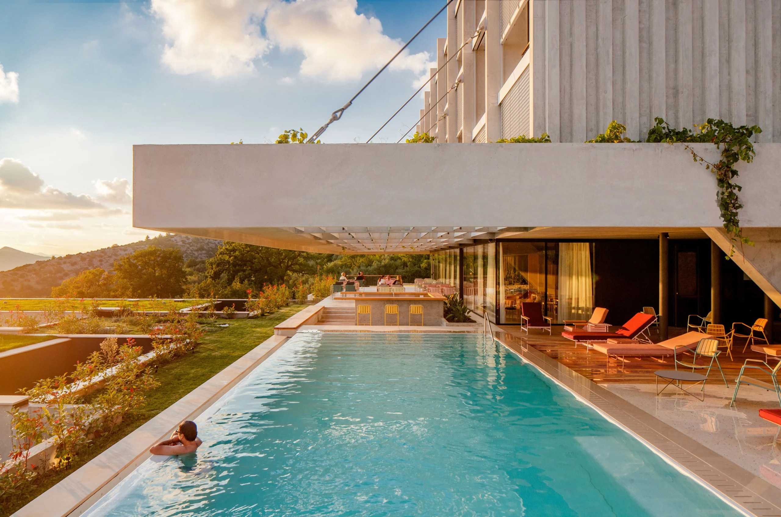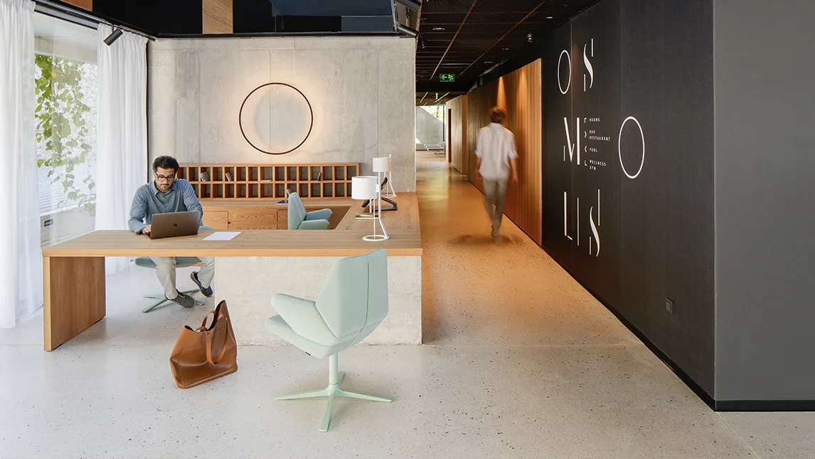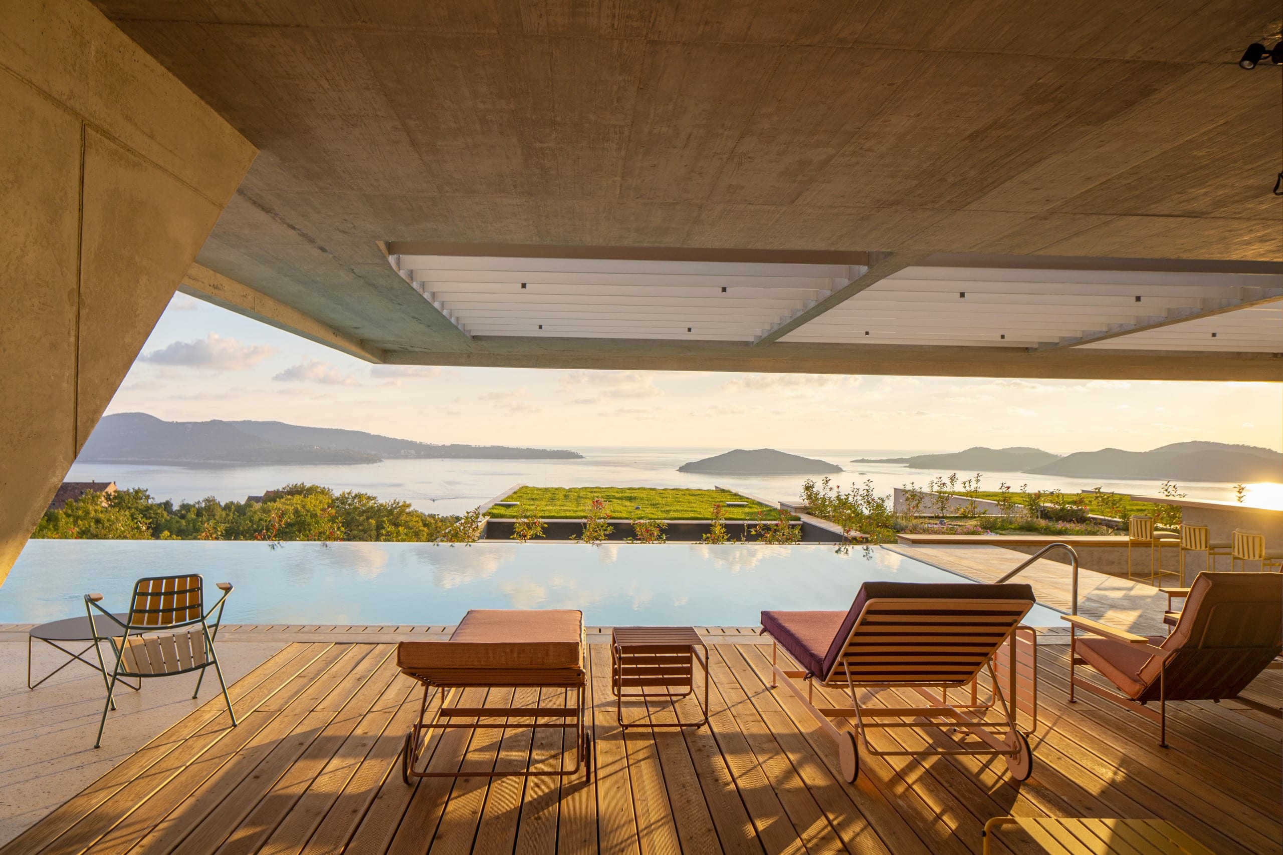 L'aménagement intérieur de l'hôtel Osmoliš réalisé par Numen / For Use s'inscrit dans la continuité de la coque en béton moderniste de l'architecte Damir Vitković, qui revient comme un élément clé dans tous les espaces intérieurs du bâtiment.