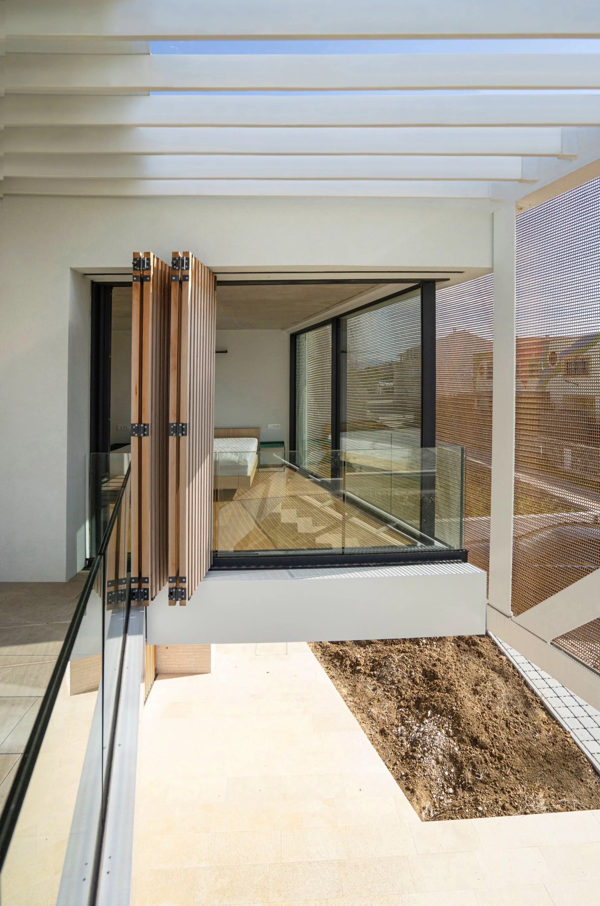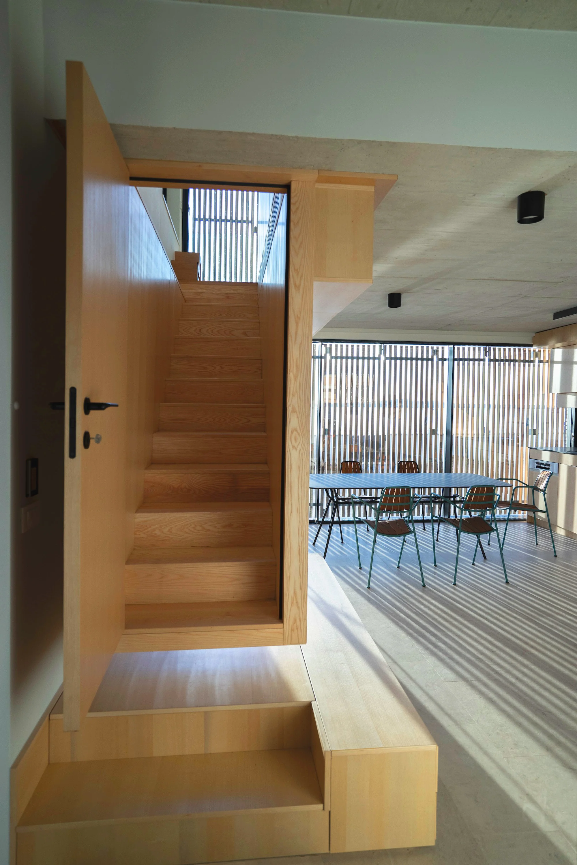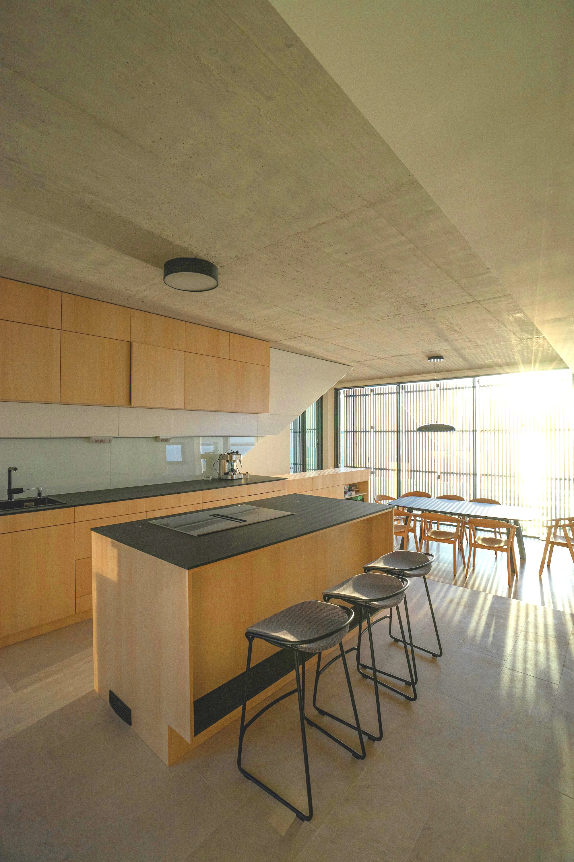 L’organisation spatiale défie intelligemment les conventions : la pièce principale de vie est placée à l’étage supérieur, où la lumière naturelle et les panoramas sont les plus généreux. Depuis la véranda protégée, ombragée par une voile textile et encadrée par une fine structure en acier, la maison s’ouvre sur un espace de vie fluide où la cuisine, la salle à manger et le salon se fondent avec harmonie. Ici, notre table Strain et les chaises Rhomb définissent avec force mais discrétion la salle à manger, leurs formes sculpturales faisant écho au langage architectural de la maison. Dans des coins plus intimes, les chaises extérieures Osmo prolongent cette conversation, transportant la même expérience vers l’espace extérieur de la maison.