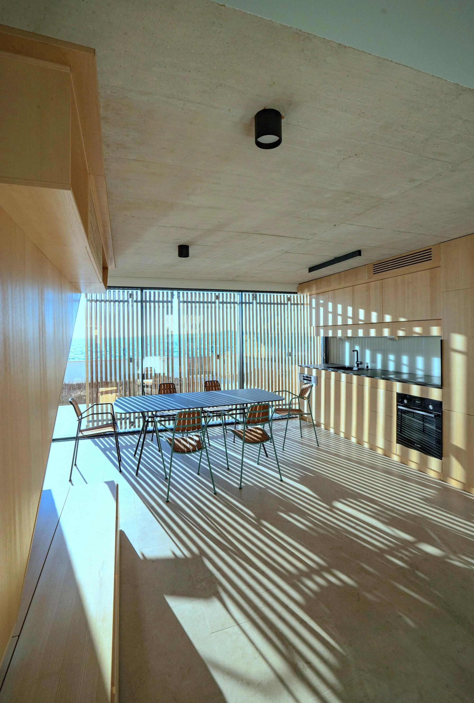 Les tabourets de bar Monk, placés près du comptoir de cuisine, offrent une géométrie douce qui contraste avec la précision architecturale, conférant ainsi au lieu une sensation de légèreté et de chaleur visuelle. Sur le balcon face à la mer, où la limite entre intérieur et extérieur tend à s’effacer, le fauteuil Polygon Outdoor invite à la détente. Dans d’autres espaces extérieurs, le fauteuil Osmo Outdoor crée un havre de calme, tandis que le regard se perd vers l’horizon marin.