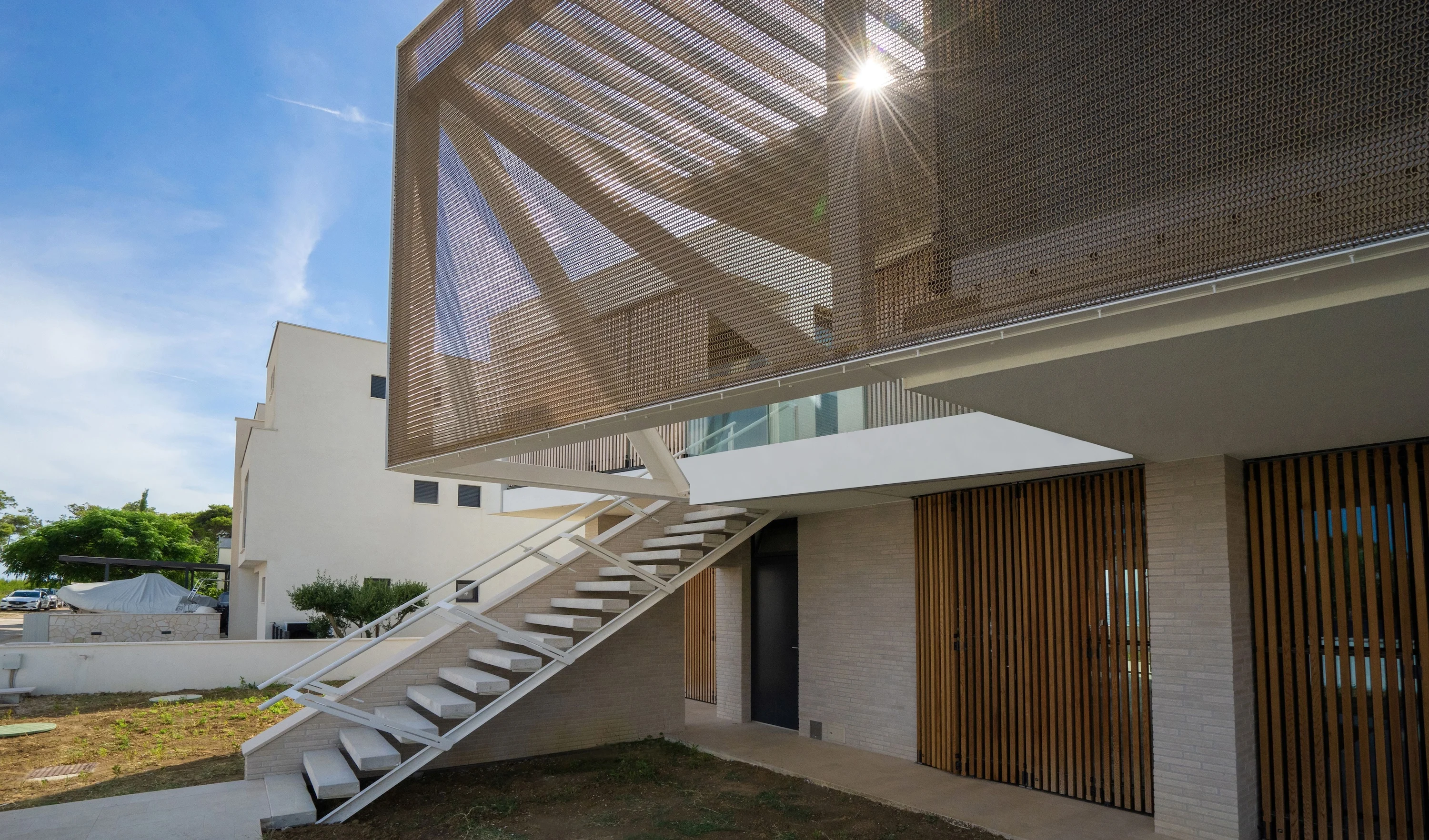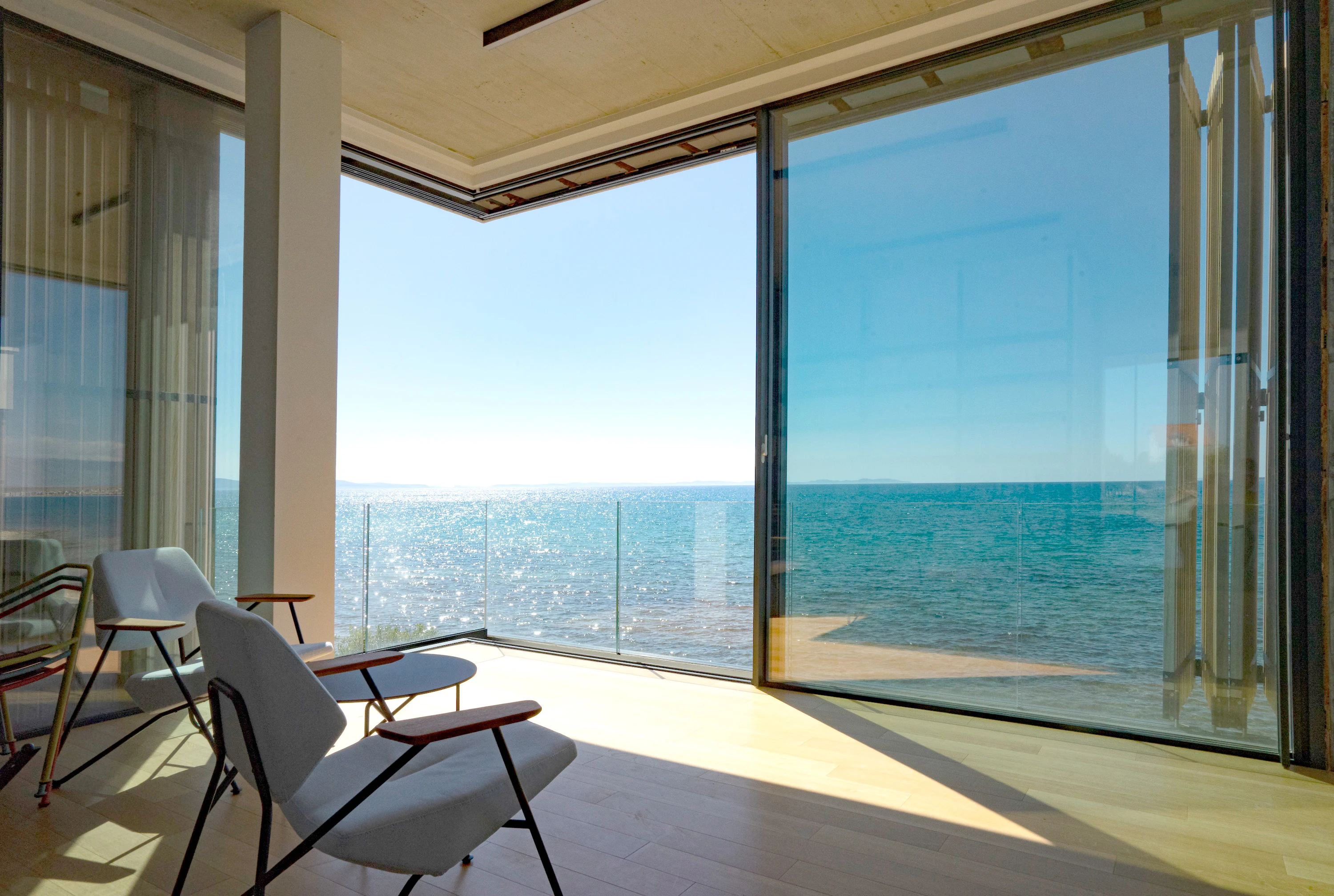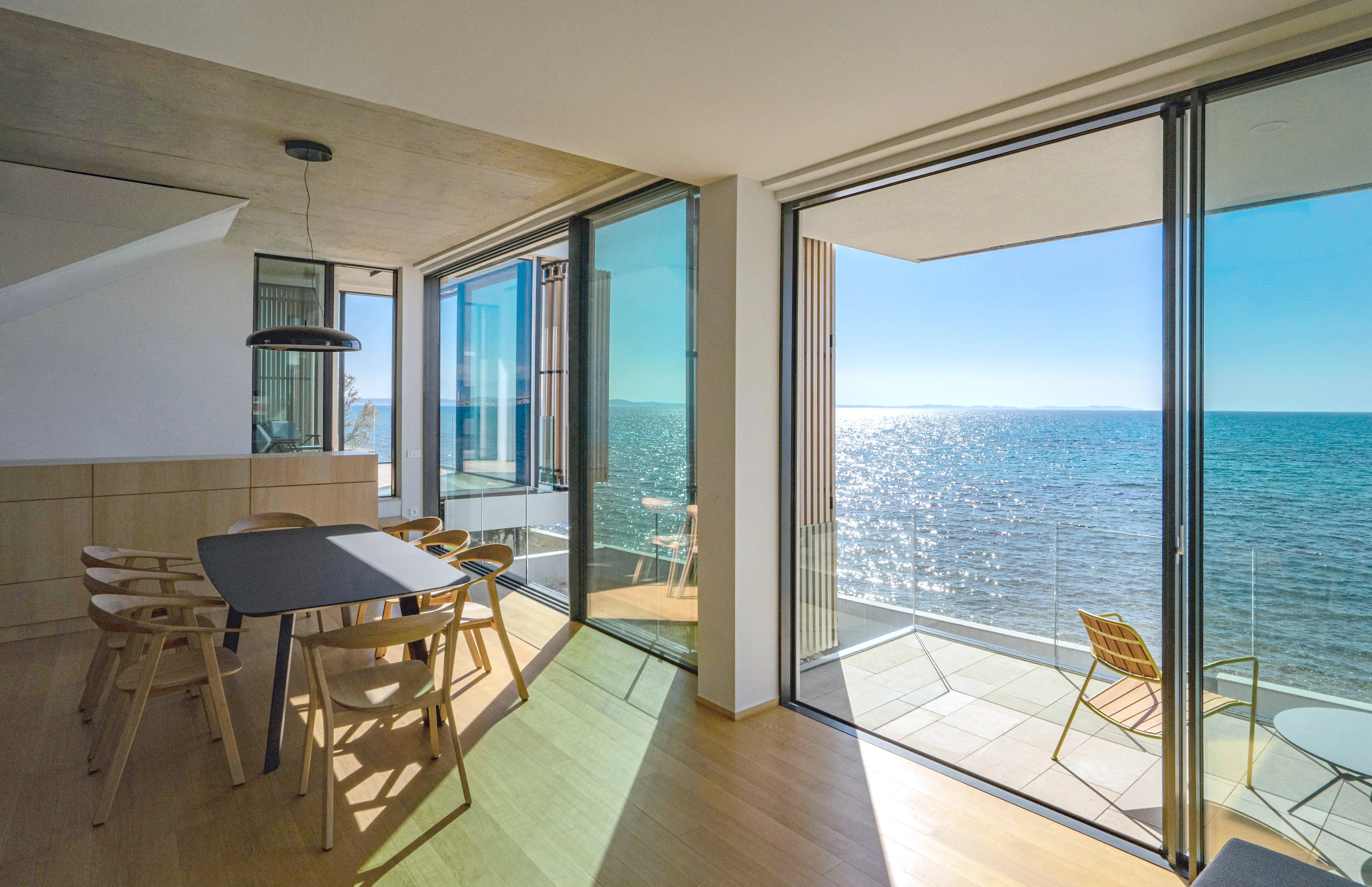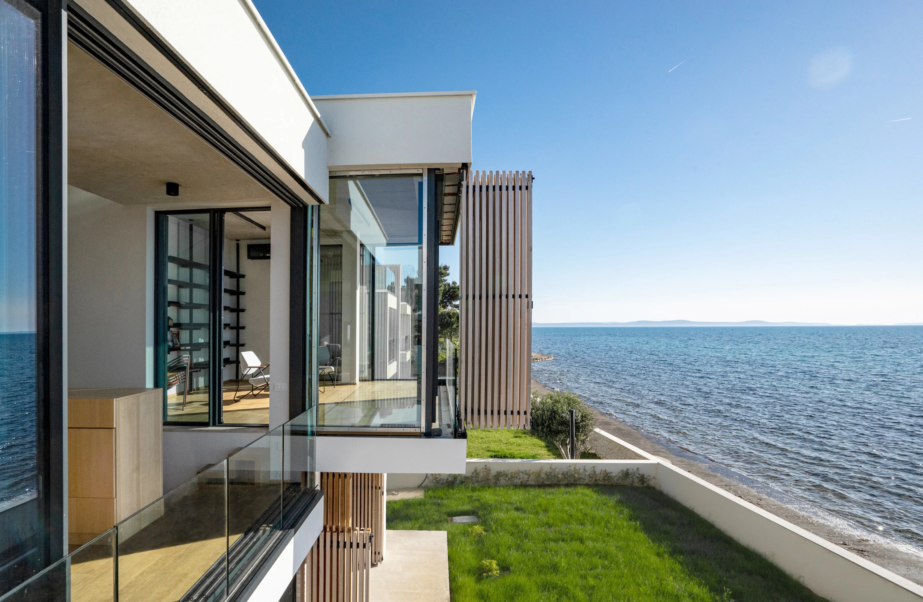 Située sur la côte de Privlaka, la Maison H est conçue comme un dialogue entre l’architecture et l’Adriatique. Sur une parcelle de 600 m², la mer et le ciel se mêlent sans cesse, tandis que les façades vitrées du sol au plafond offrent une ouverture spectaculaire sur l’horizon.