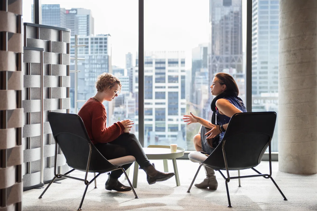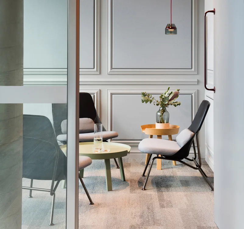 De petits salons confortables avec des fauteuils Strain et des meubles modulaires et adaptables donnent aux nouveaux bureaux de PwC une atmosphère résidentielle où les clients et les cadres se sentent détendus et inspirés. Fauteuil Strain fourni par Stylecraft.