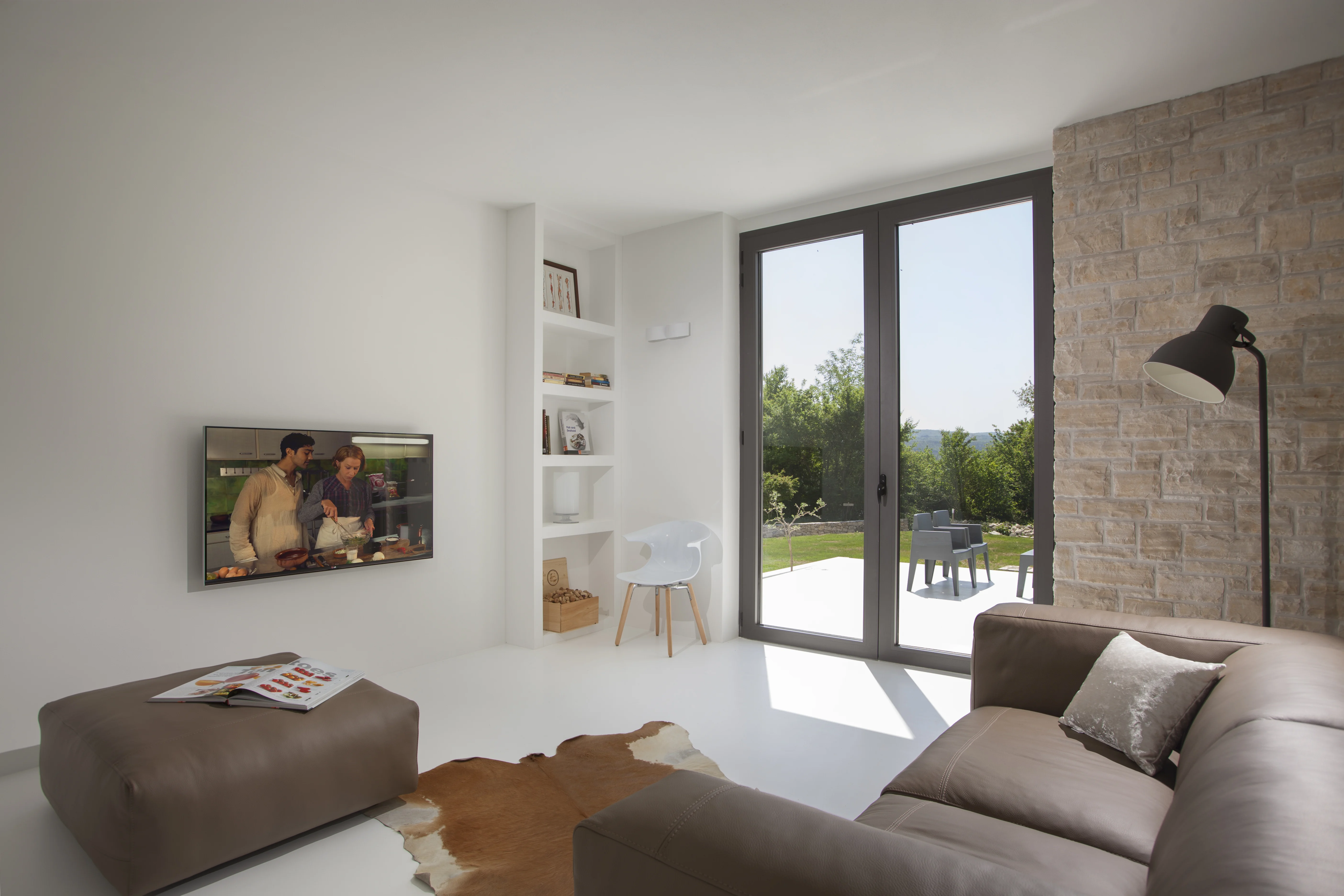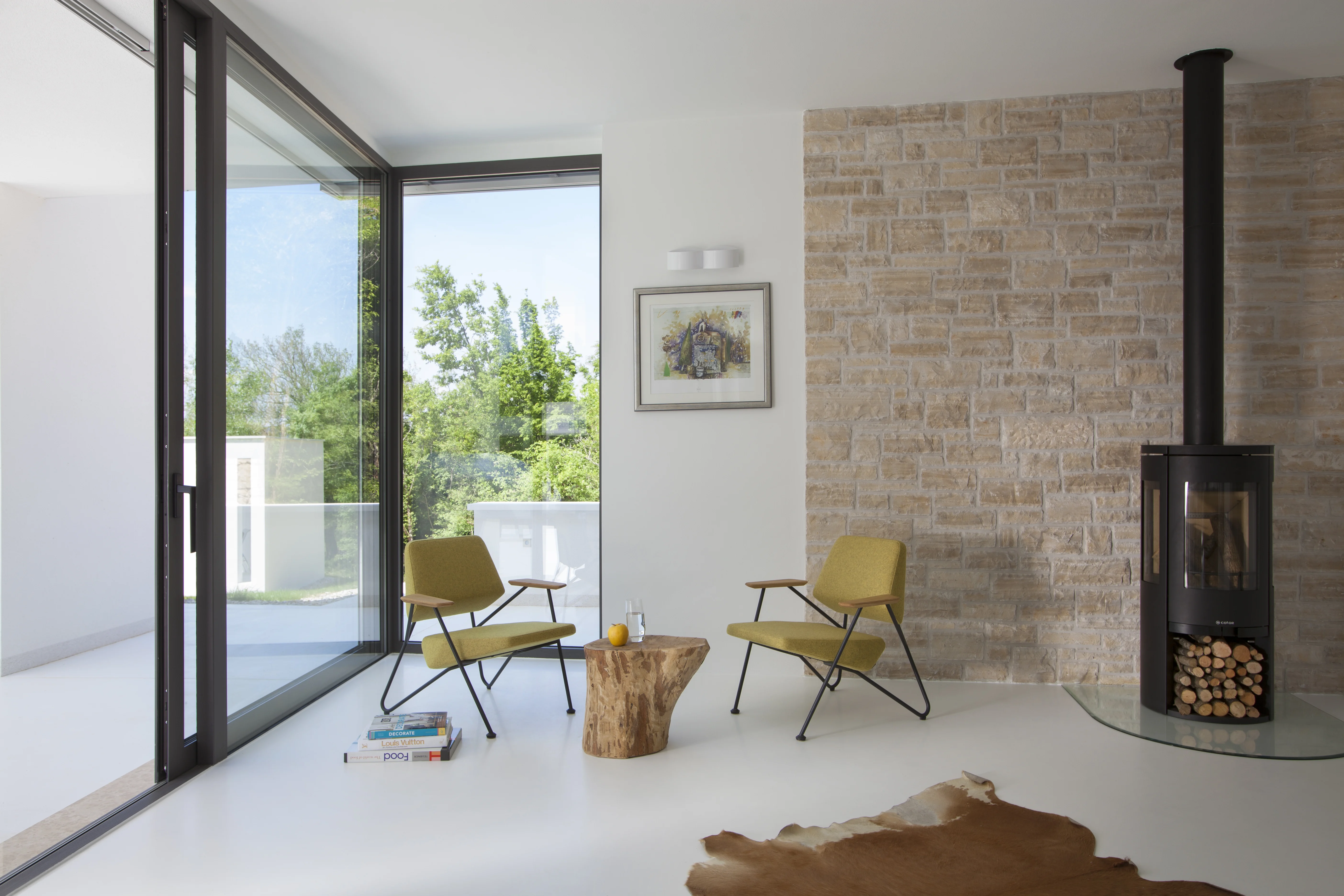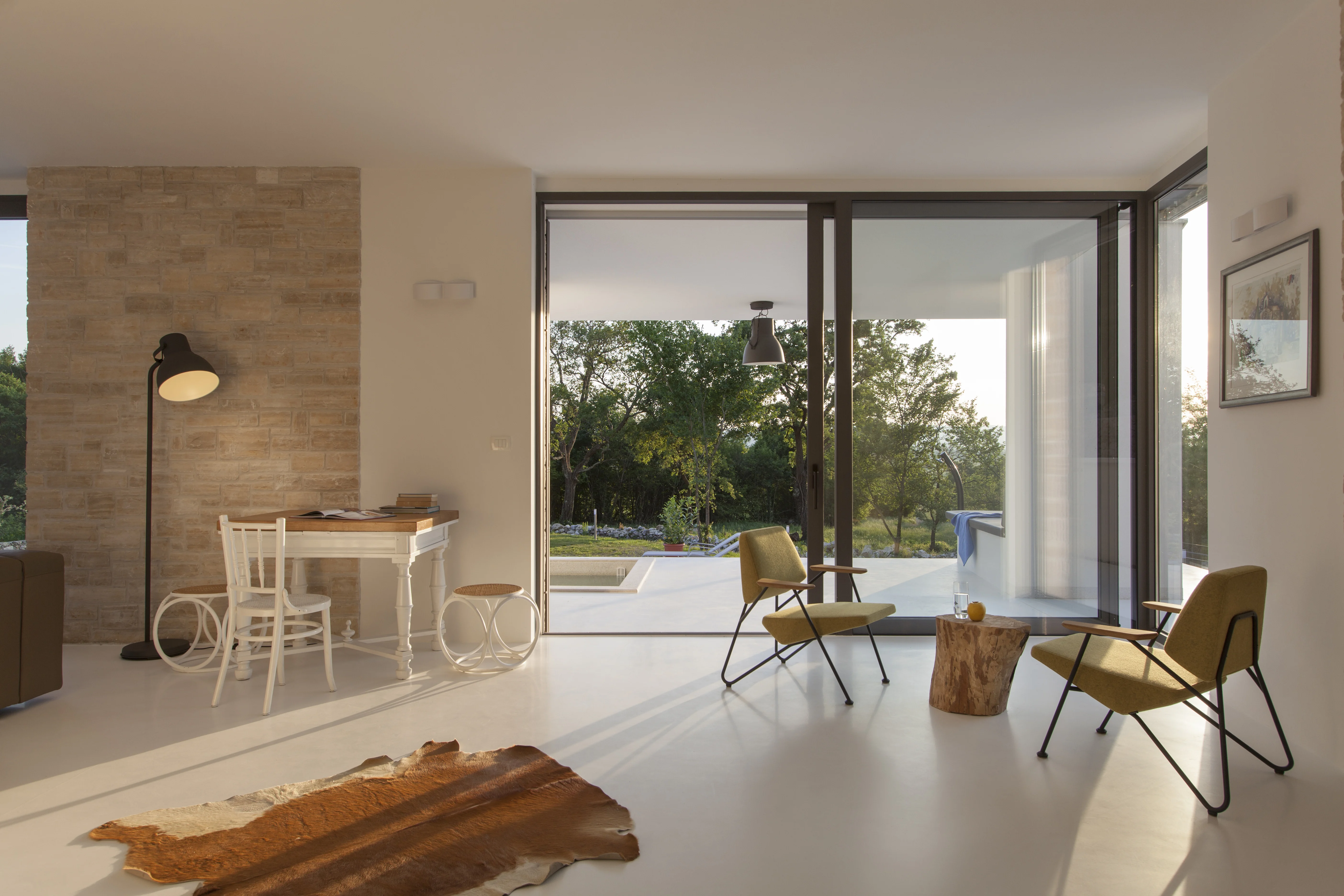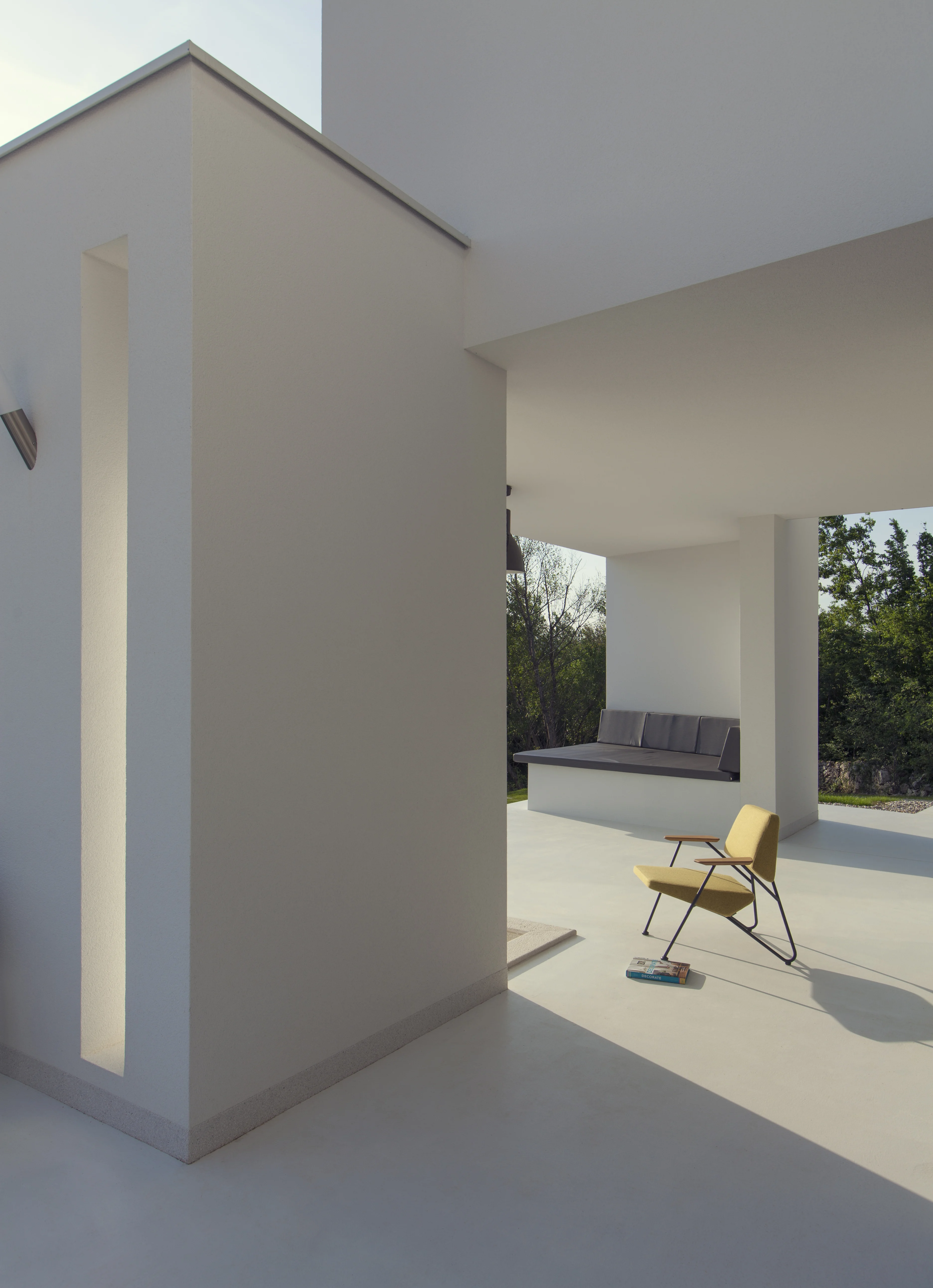 Une villa moderne aux cubes intéressants, de surfaces claires en béton, en pierre ou en bois - complétée par des articles de Prostoria s'adaptant parfaitement au style léger - le canapé en cuir Cloud, les fauteuils Polygon en couleurs intenses.