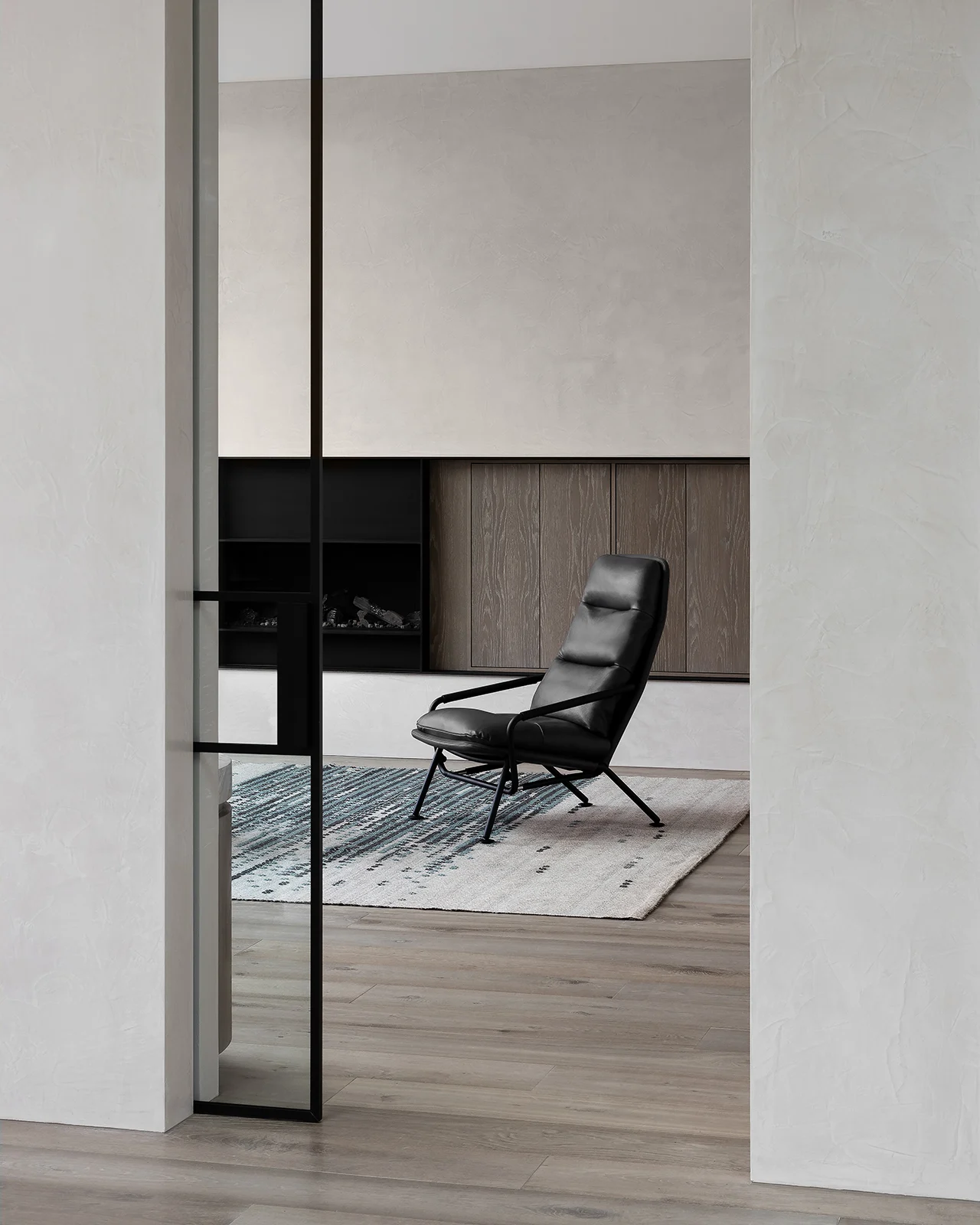Prostorijin namještaj naglašava ovu harmoniju između forme i udobnosti. Dnevni boravak krasi sofa Match u svijetlosivoj tkanini, uparena s niskim stolićem Avet, dok naslonjač Kontrapunkt u crnoj koži zaokružuje prostor — stvarajući opušten ambijent koji poziva na zadržavanje.