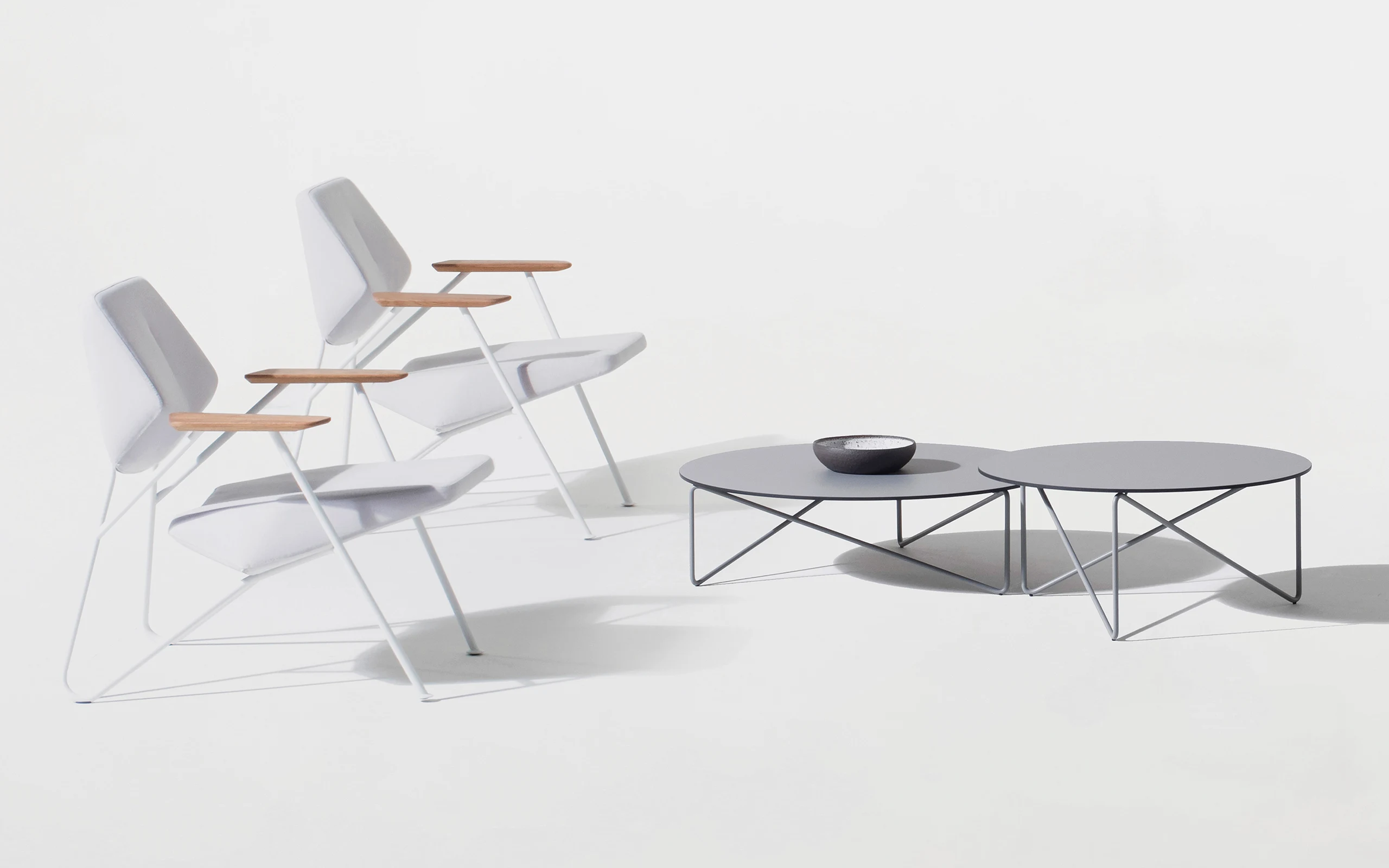 Polygon Outdoor easy chair brings the iconic triangulated form into the open air. Its lightweight steel frame is treated for outdoor durability, maintaining the chair’s graphic rhythm and shifting geometry. From triangle to hexagon, its shape evolves with your view. Comfortable, weather-resistant cushions offer support without bulk, making it ideal for patios, terraces, or gardens. A design that feels airy, sculptural, and made to last through all seasons.