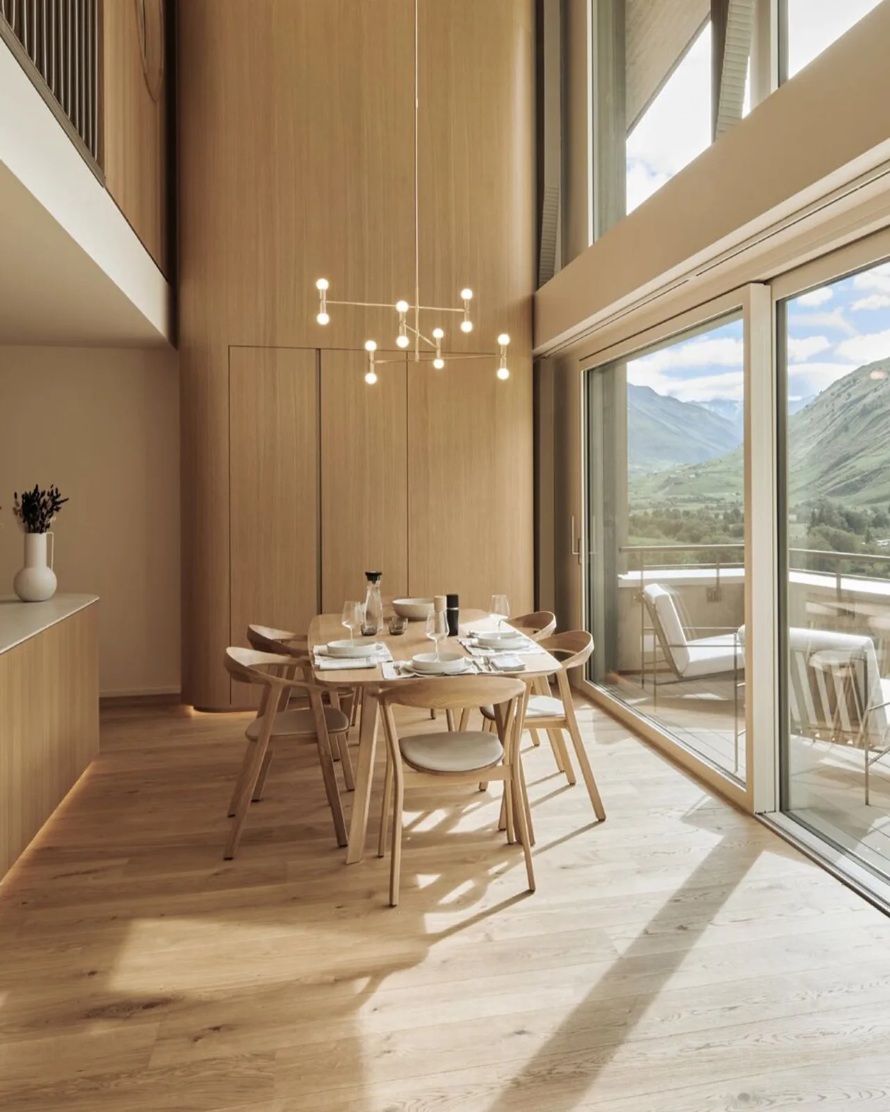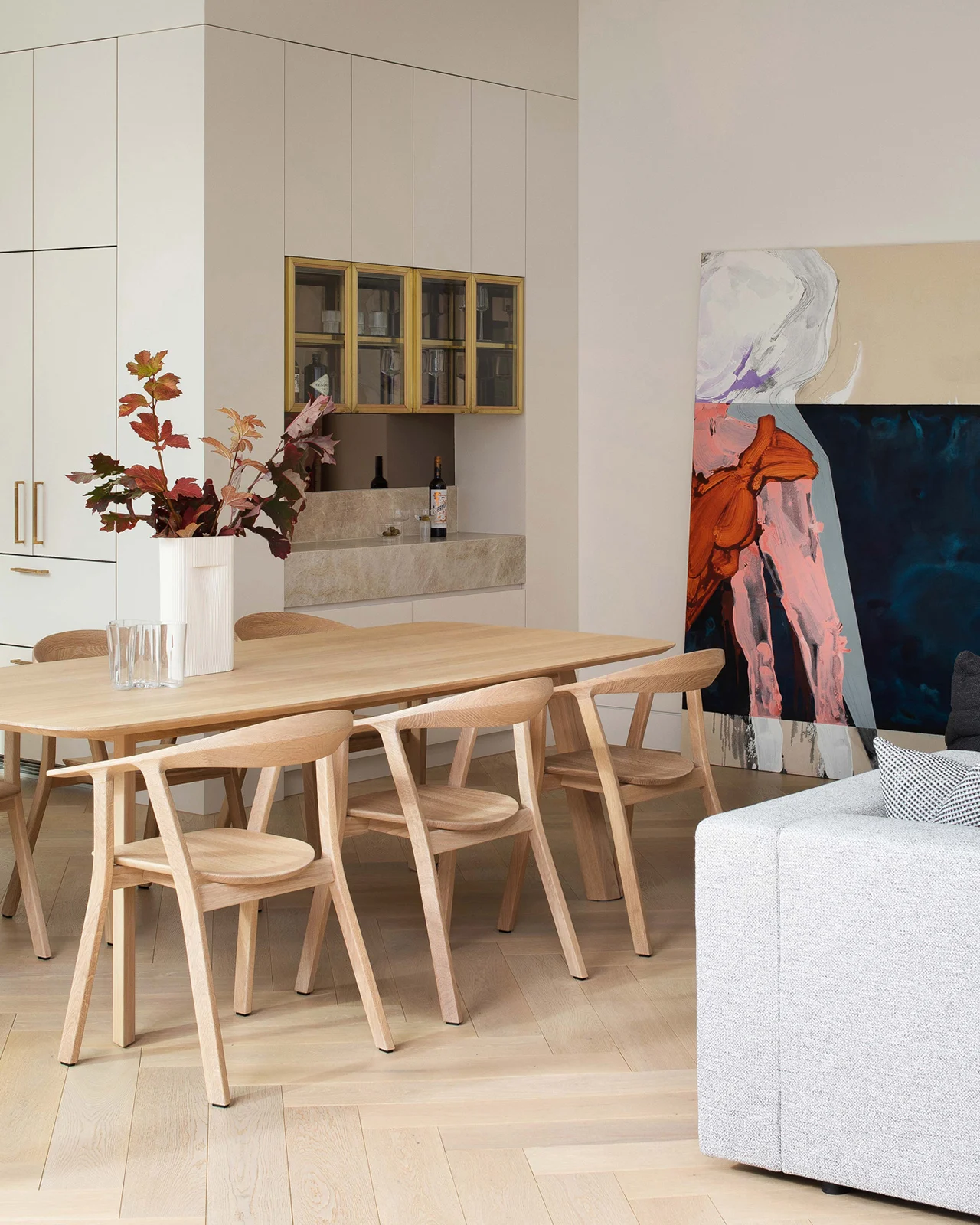 The Rhomb table pairs sculptural elegance with architectural detail. Its rhomboid legs are placed diagonally at the corners, creating a dynamic play of widths when viewed from different angles. The tabletop features a lens-like form with sharp knife edges, adding lightness and precision. Available in solid wood or with a sleek Fenix top, the Rhomb table brings a refined presence to dining interiors, blending craftsmanship, balance, and character.