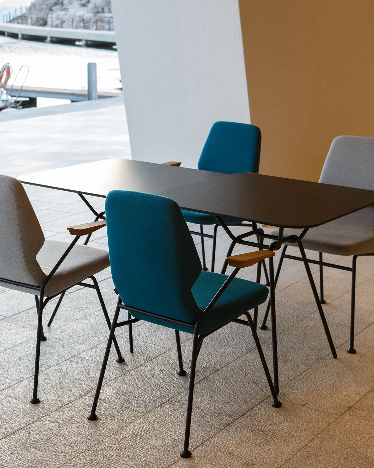 Strain Outdoor low table brings sculptural clarity to relaxed settings. Its airy base, formed by interwoven steel tubes, supports a thin tabletop in compact HPL - visually light, yet built to endure the elements. Designed to complement lounge seating, it adapts with ease across outdoor spaces. Also available in Fenix NTM or MDF with lacquered edges for indoor use, this elegant table comes in various sizes and heights, fitting seamlessly with a wide range of chairs.