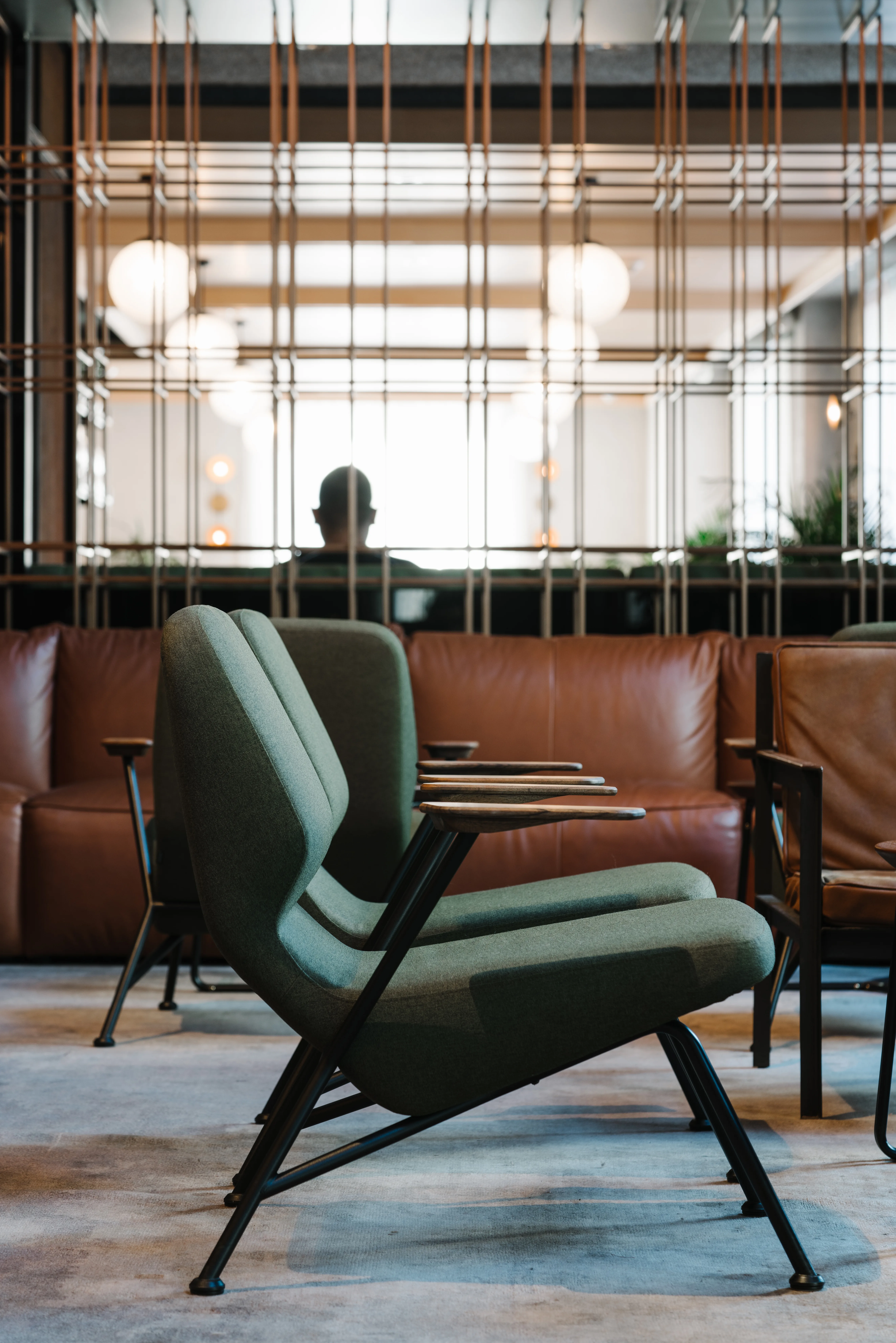 Central element is the extravagant lobby, with a glass roof top, and visible structure of the roof. Polygon and Oblique easy chair blend perfectly with the brick walls, brass, black varnished metal, combined with wood.