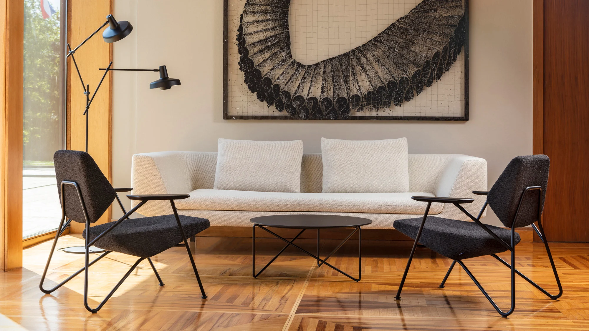 Combine sofa, Tinker low table; Artwork: Ivan Picelj, Composition W, 1956; Lamp Arigato (Grupa)
